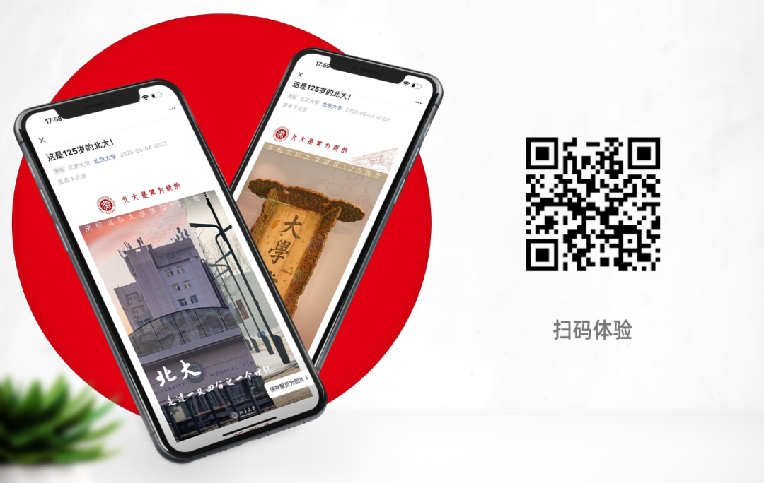 5月4日也是北京大学的校庆日,在《这是125岁的北大!》的开篇,采用 SVG 轮播图+浮层 CSS 结构形式,形成了多图画面在文案下方滚动播放的特效。