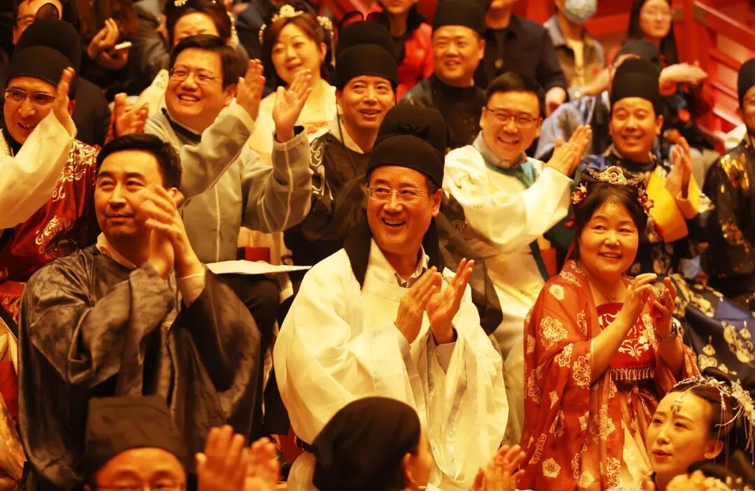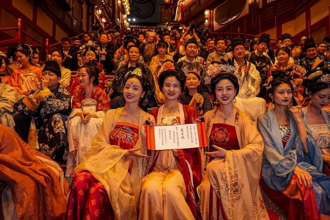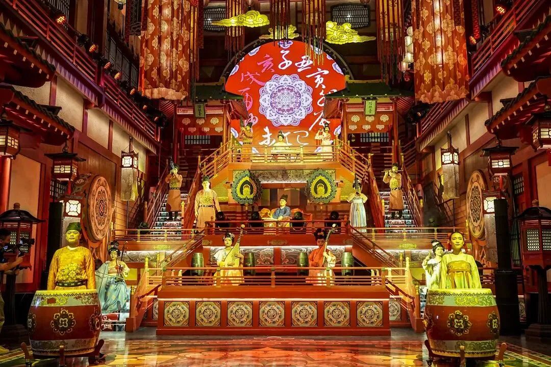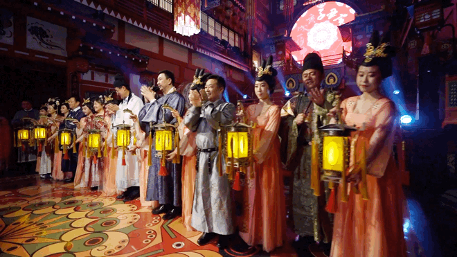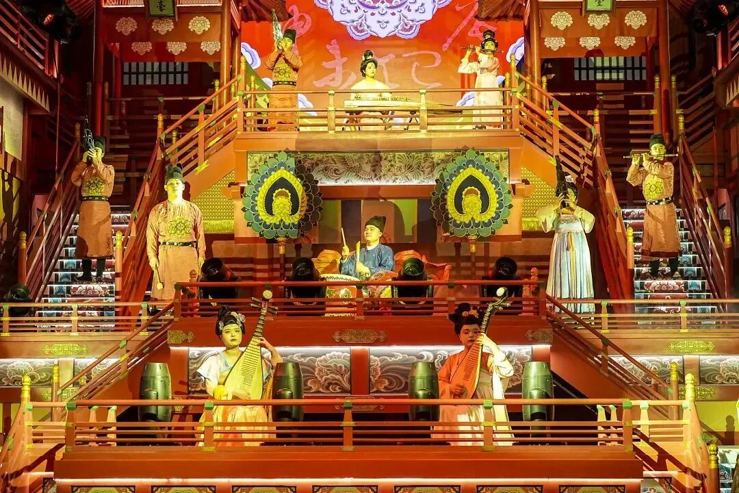 晚上戌时,“多国佳丽·潮长安”长安十二时辰主题街区周年庆盛典在鼓乐齐鸣的热闹氛围中拉开序幕,乐师们向观众演绎了“长安鼓乐鸣,音自大唐来”的盛唐宫廷音乐魅力。
