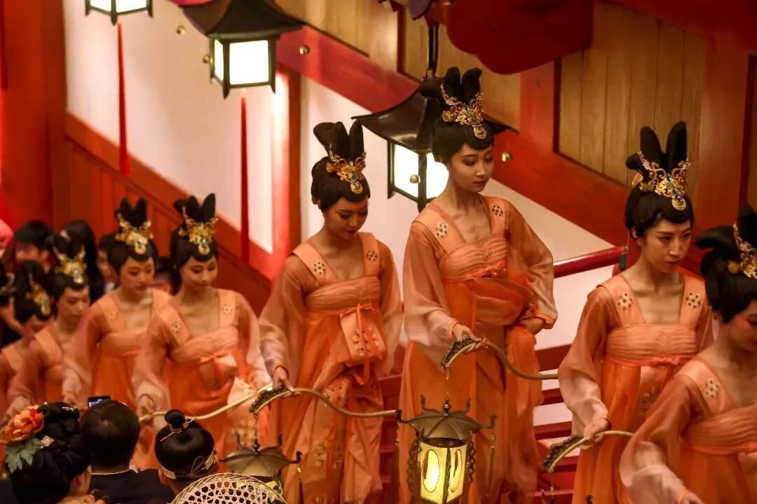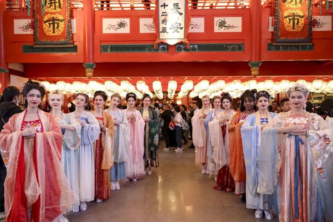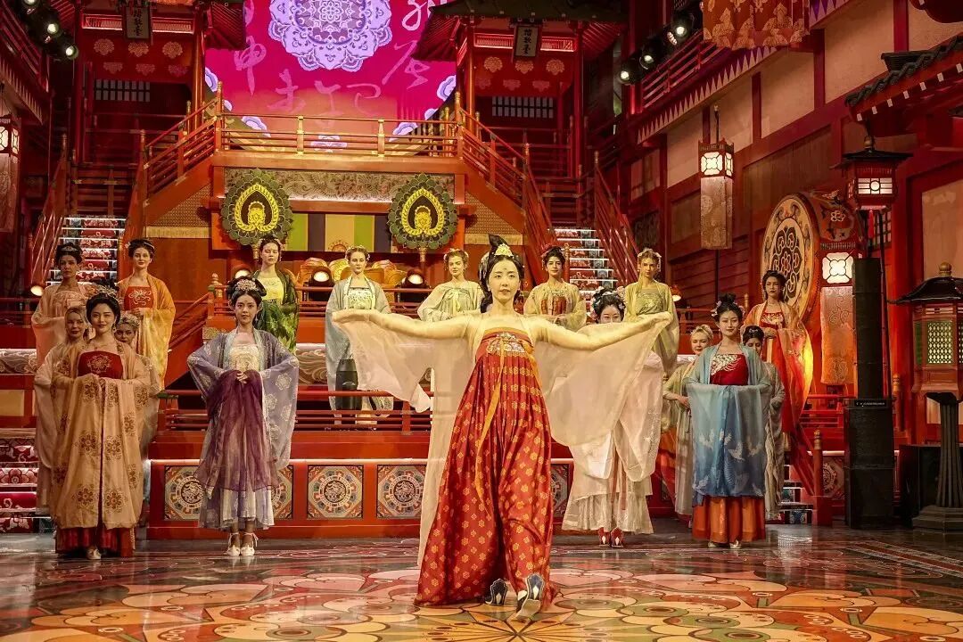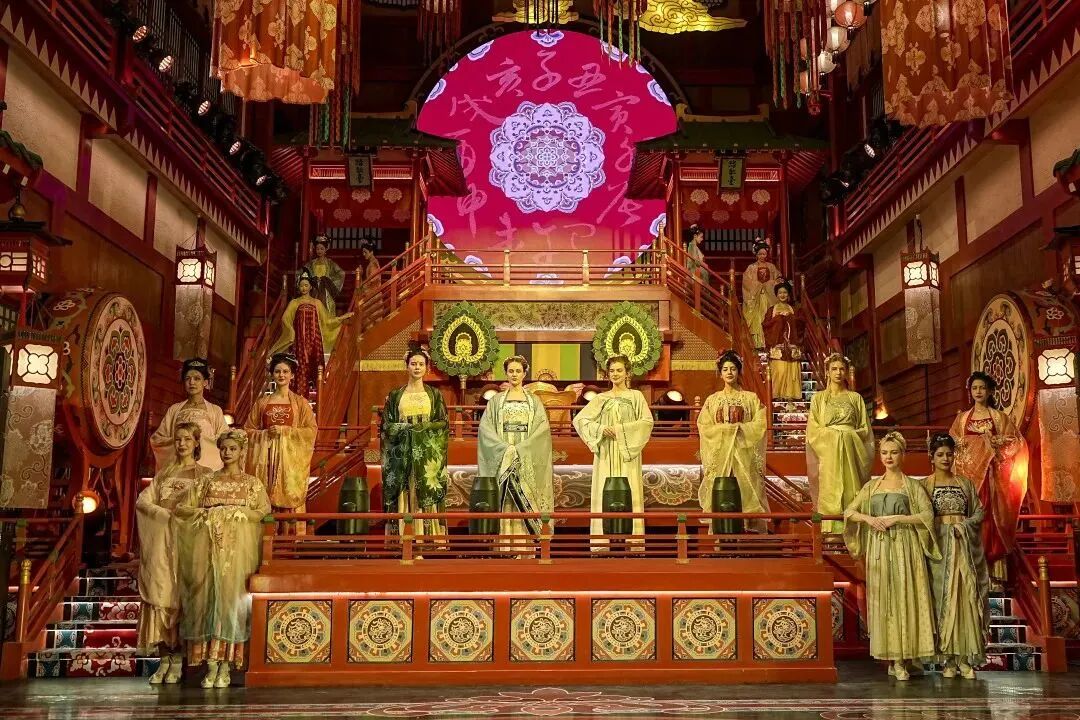一曲暂歇佳人至。来自世界各地的佳丽超模们带来一场唐风美学与时尚潮流相碰撞的唐风华服走秀,正是“纤腰束素,迁延顾步”,重现一千多年前长安城开放包容的盛况。