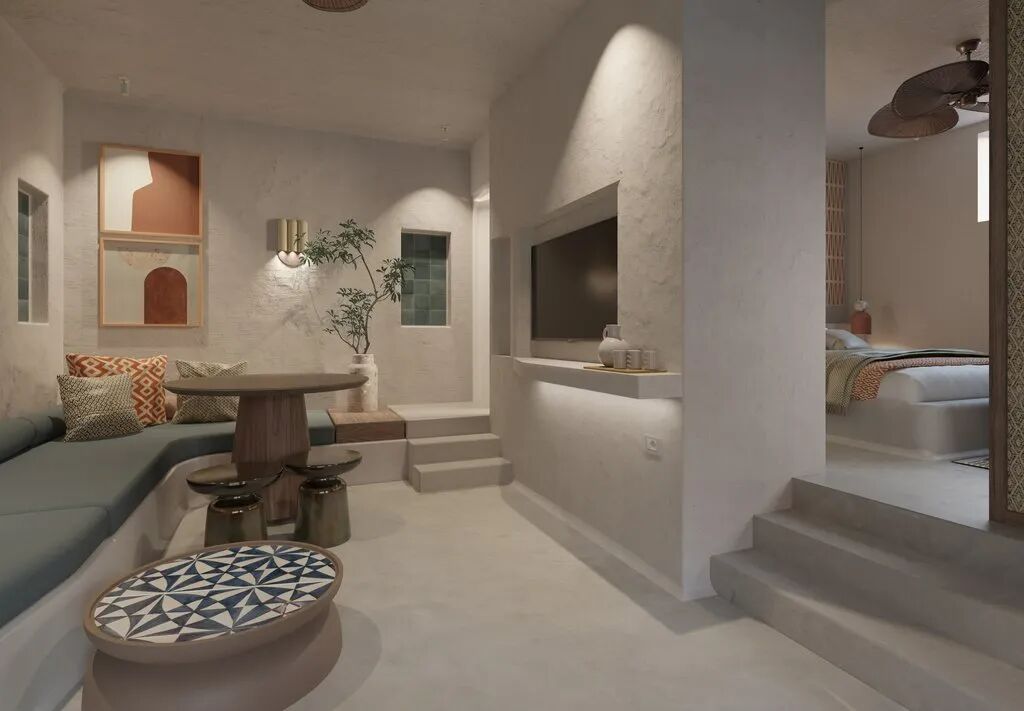 以白色立体主义的愿景,米诺斯酒店(Minois)旨在展现对传统基克拉迪建筑的当代演绎,将帕罗斯岛屿几何形状的棱角、海洋森林美景的起伏与汲取自地中海周边国家的灵感相结合,极具鲜明而和谐的反差艺术感。