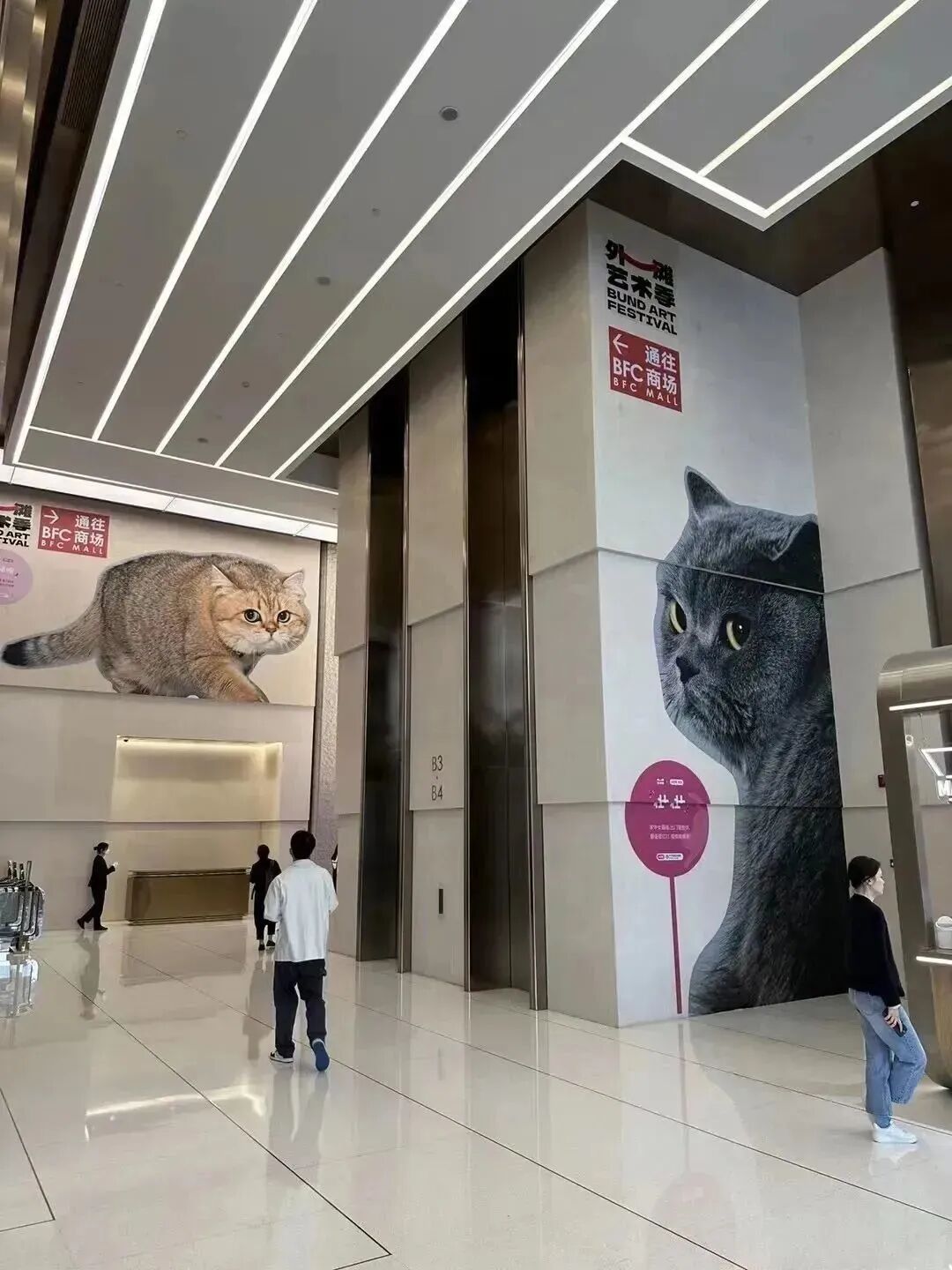 而近日,猫咪墙贴也“攻占”了BFC的办公楼与商场空间,随处可见的猫咪形象,让你转角遇见公共艺术。
