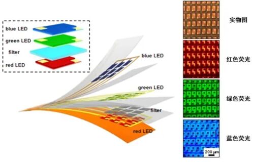通过外延剥离和转移印刷的方法,将基于不同无机III-V族单晶半导体结构的薄膜式Micro LED,包括铟镓磷基(InGaP)红光LED、铟镓氮基(InGaN)绿光和蓝光LED(尺寸~100μm2,厚度~5μm)异质集成,形成垂直堆叠结构。同时,通过设计具有波长选择透过的光学薄膜作为Micro LED之间的界面层,提高了器件的发光效率和辐射性能。