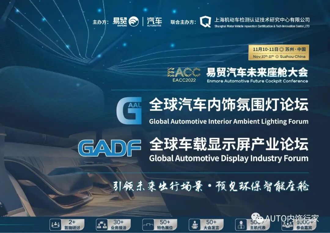 由易贸汽车和上海机动车检测认证技术研究中心有限公司共同主办的2022全球汽车内饰氛围灯论坛及全球车载显示屏产业论坛,在全国汽车标准化技术委员会灯具及灯光分技术委员的指导下,将于2022年11月11日,在苏州举行,同期将举行EACC2022易贸汽车未来座舱大会,在“碳达峰•碳中和”的具体目标下,邀请超过千位的全球汽车内饰座舱领域的专家一同探讨交流。