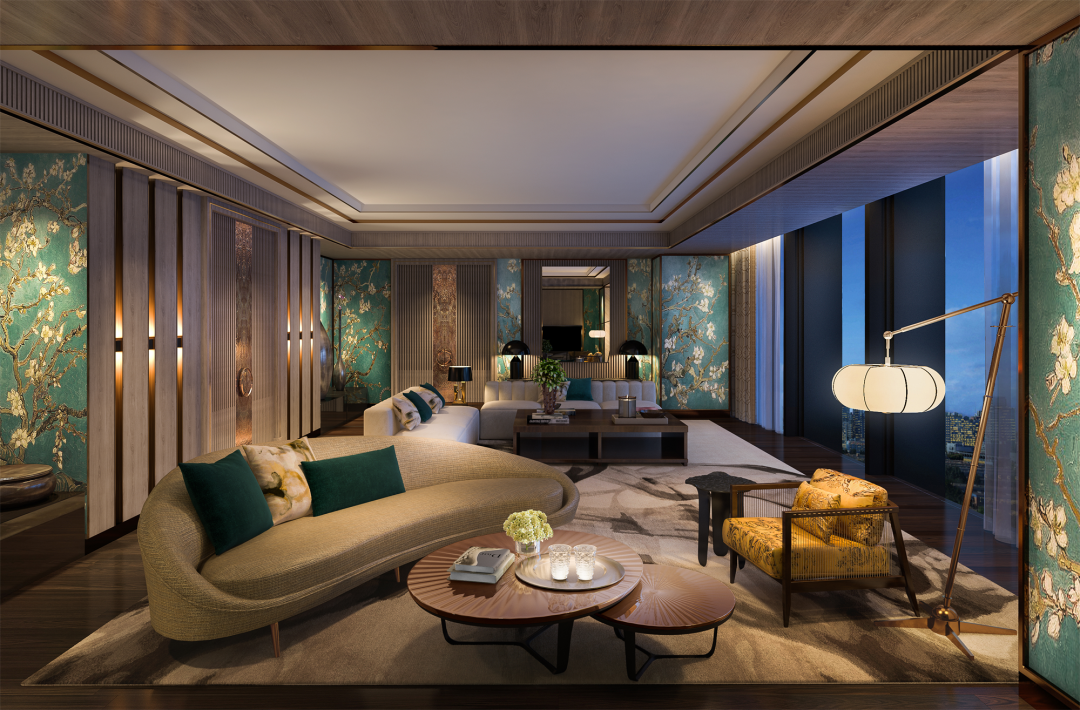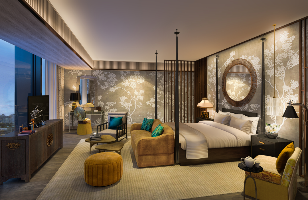 进入总统套房,我们会对传统工艺与现代家具的结合感到耳目一新,大漆、珐琅、织金等传统工艺的运用、以中式樟木箱为灵感设计的电视柜,都是中国传统工艺的缩影,细节之处更加突显匠心。