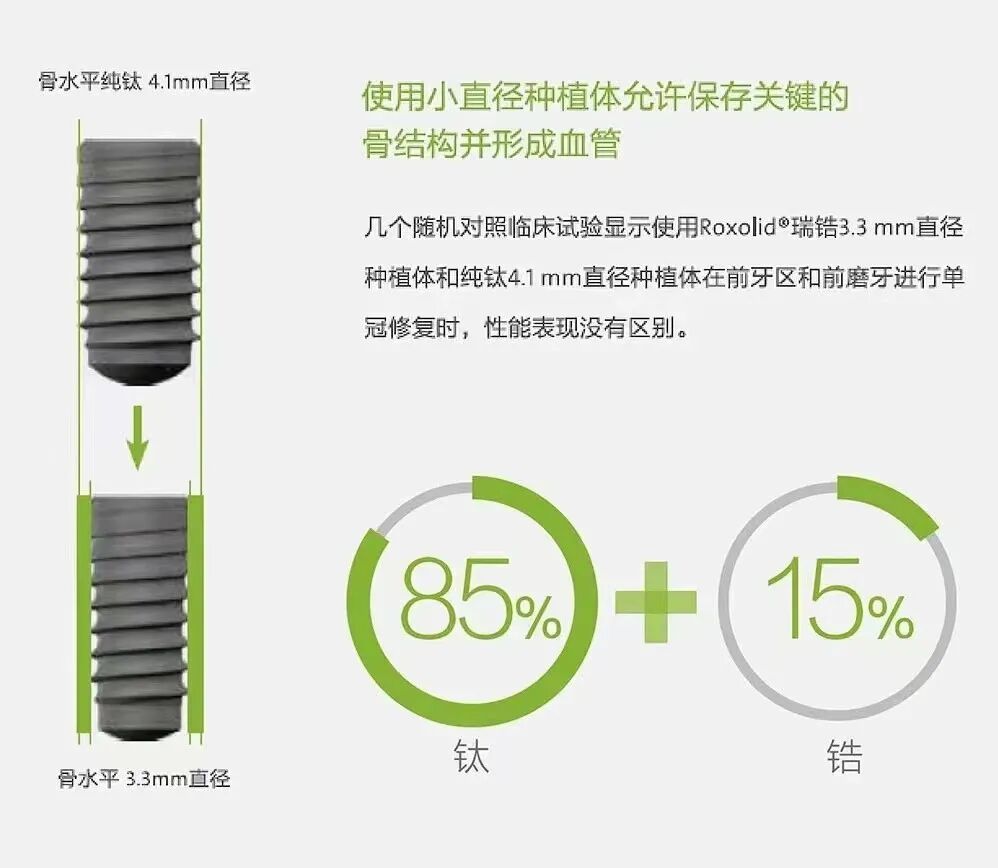 钛锆合金采用85%的钛和15%的锆,本身钛就有很高的强度,有人造骨骼之称,再有锆的加入,强度就更上一层楼了。因为种植体强度更高了,那相同情况下就可以使用更小直径的种植体,所以手术会更加微创1。