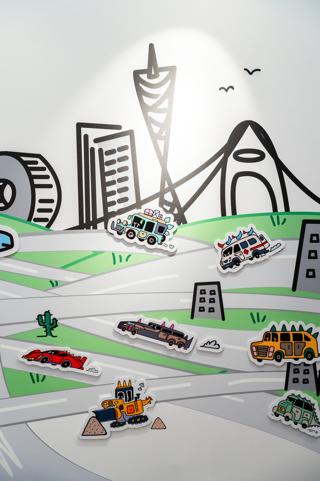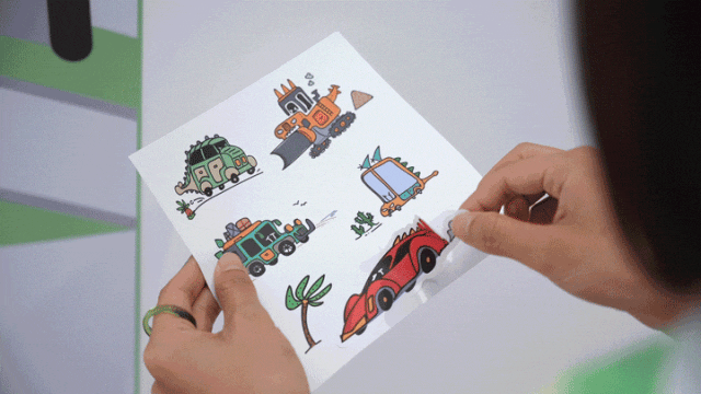 放在一旁的恐龙汽车贴纸,就是被马门溪龙吞下后变形的小汽车。挑选一辆喜欢的小汽车吧!把它贴到马路上,和马门溪龙共同构建一个神奇的恐龙世界。