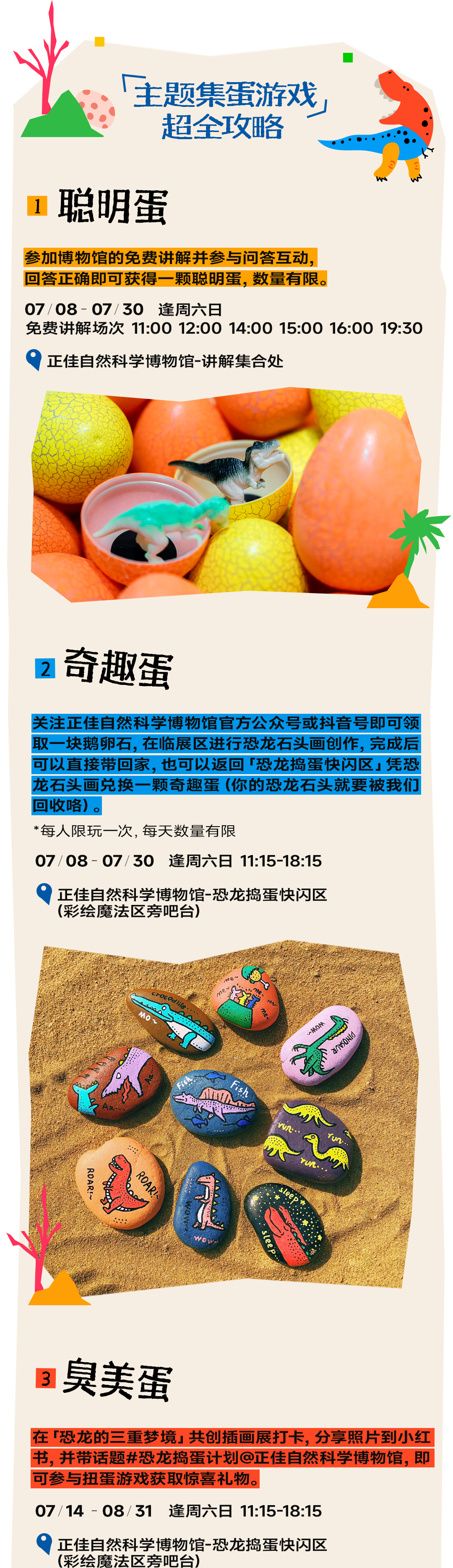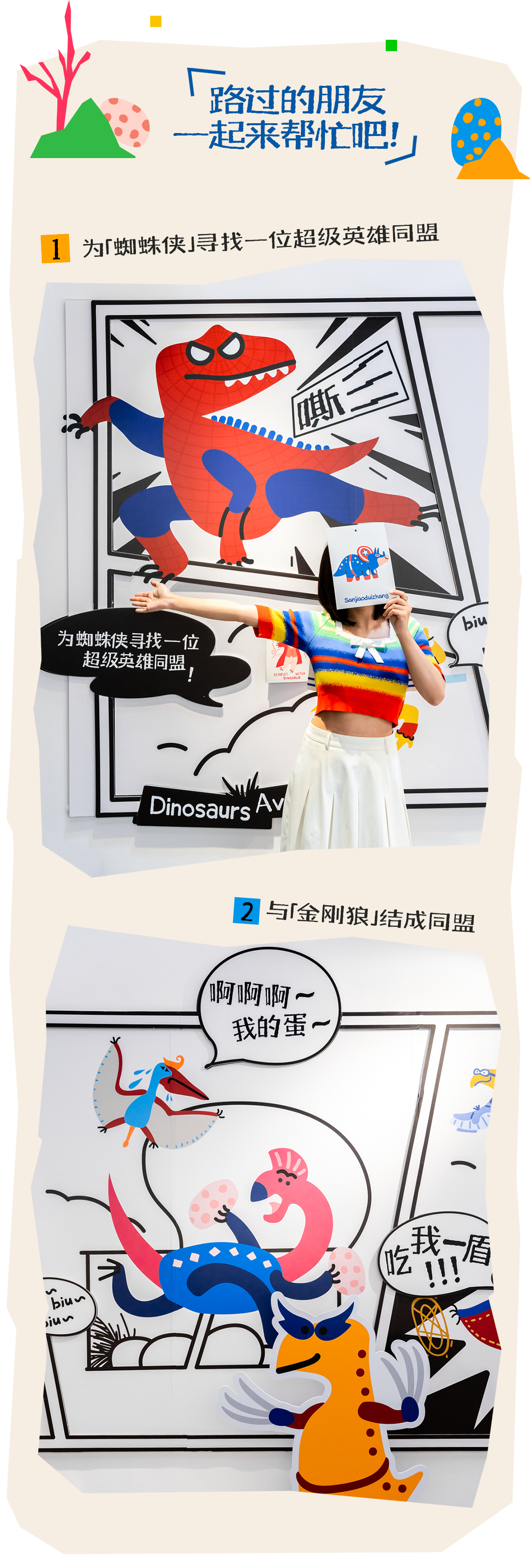 逛恐龙共创插画展、寻找「恐龙蛋」、围观展览共创、加入恐龙主题workshop、观看恐龙沉浸式剧场……