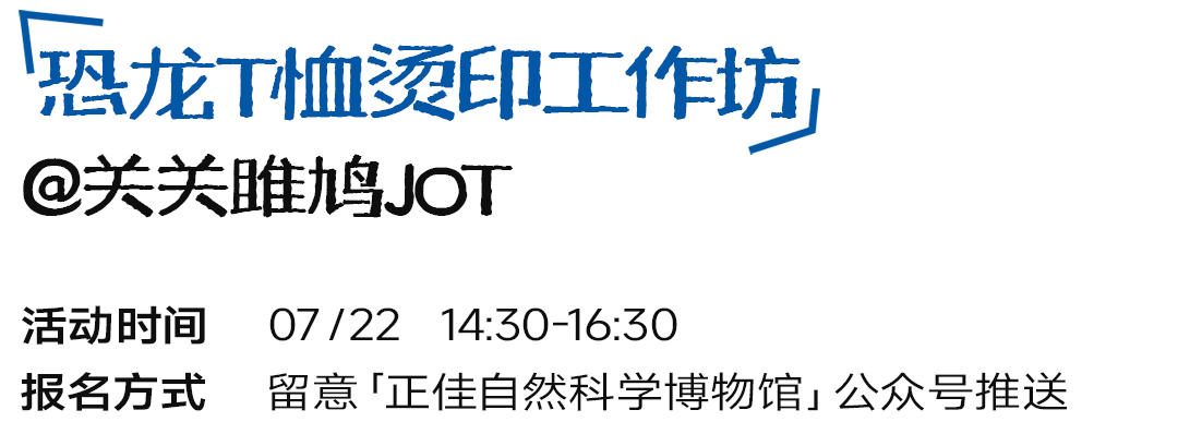 在7月22日,原创插画商店「关关雎鸠JOT 」将带来恐龙T恤烫印工作坊。参与者可以选择自己喜欢的恐龙图案,自由印在T恤上,还能把自己设计的T恤带回家。
