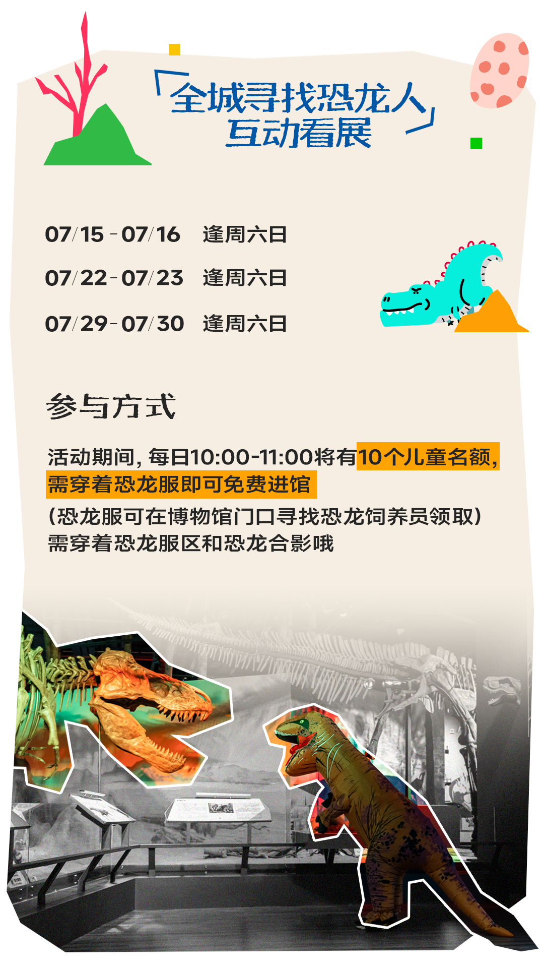 参与方式很简单,只需要穿上恐龙服饰,在馆内与恐龙合照打卡就可以。现场也提供恐龙服,可在博物馆门口向恐龙饲养员咨询。免费名额有限,先到先得,想参与的话记得要早到!