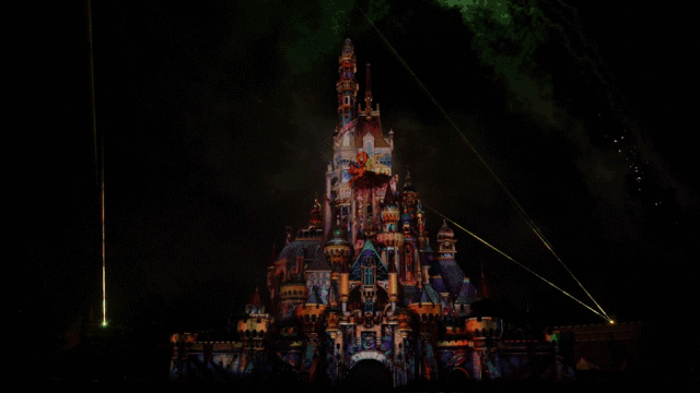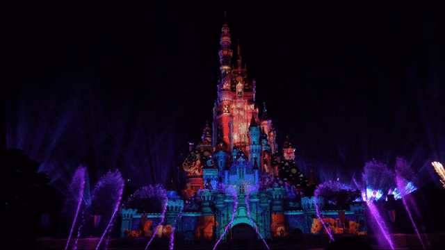 多位迪士尼及皮克斯角色的投影现身塔楼,甚至从城堡腾飞至水幕喷泉之上,大约 150位迪士尼朋友轮番演绎着六个人生的重要章节。