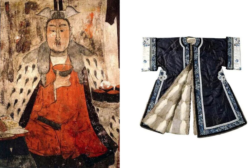 ▲ 左图出自山西太原的北齐徐显秀墓壁画,画面中的人物正是墓主人徐显秀,穿着一身光鲜豪华的裘皮外衣。魏晋南北朝时期,名贵的裘是权贵阶层行仪风雅的标志,徐显秀的这件白裘上拼缀着黑色斑点,可能是《梁书》中提到的中亚游牧部族进献的“白貂裘”。毛锋朝外的翻毛服装称为“裘”,毛锋朝里的称为“反裘”。右图为清代反裘石青三蓝绣镶边女皮褂。