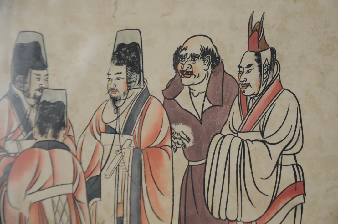 ▲ 章怀太子李贤,高宗第六子,武则天次子。其墓地于1971年被发掘。墓中出土壁画五十多幅,画工精美,保存基本完好。在东壁壁画《职供图》中,描绘了万国来朝的场景。右数第二位,高鼻梁,身着翻领长袍,同左侧三位大唐官员形成鲜明的对比。据考证,他是来自拂菻(东罗马帝国)的使者。