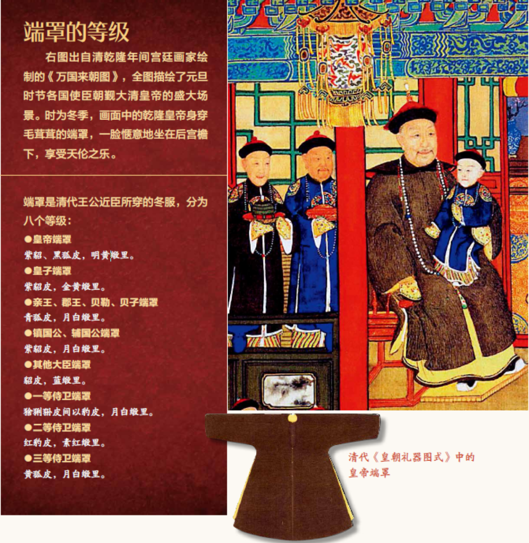 帽冠用黑狐皮和紫貂制作,外套是毛茸茸的“端罩”——一种清代皇帝、诸王、近臣过冬专用的翻毛外褂,分八个等级,每个等级的质地、皮色、颜色各不相同。等级最高的御用端罩,以明黄色缎为衬里,质地为最暖和的紫貂或玄狐——光是看着都觉得热。