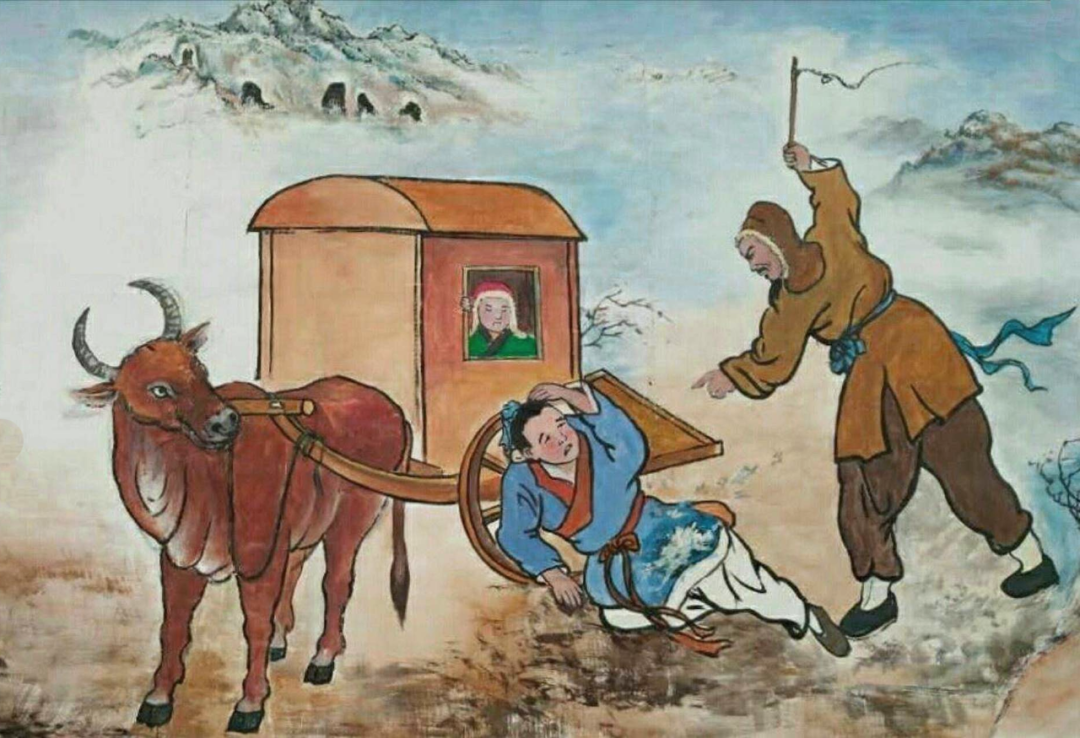 闵子骞生母早死,父亲娶了后妻,又生了两个儿子。一个大雪纷飞的日子,子骞随父赶牛车外出,狠心后母偷工减料,用芦花填充他的袄衣。子骞冻得瑟瑟发抖,连缰绳都握不住,车上的二弟则喜眉笑眼。其父见状,气得用鞭子抽打子骞,刹时间,子骞的袄烂而芦花乱飞。父亲才发现,幼子绵衣都絮着货真价实的丝绵,子骞穿的却是芦花袄。于是立即赶车返家,怒而休妻。子骞跪求父亲饶恕后母:“母在一子单,母去三子寒。”后母感动认错。![]()