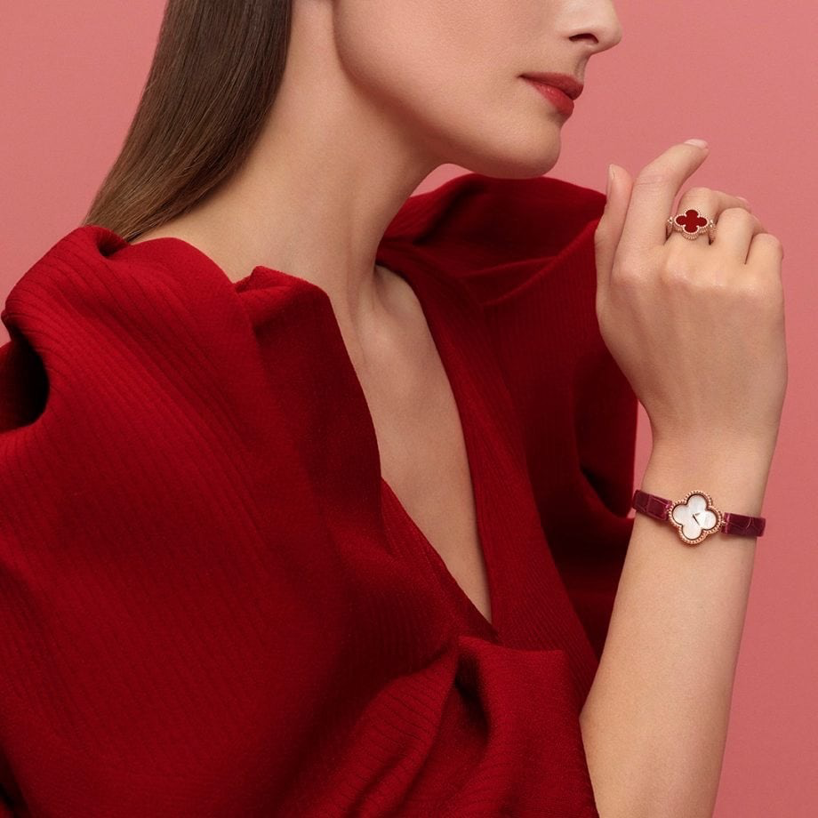 此次推出的Alhambra系列款款臻作,忠于Alhambra系列的经典美学,柔和的玫瑰金与温煦的红玉髓和谐交织,以精致圆珠,勾勒标志性四叶草幸运主题图案的轮廓,彰显世家匠心工艺。