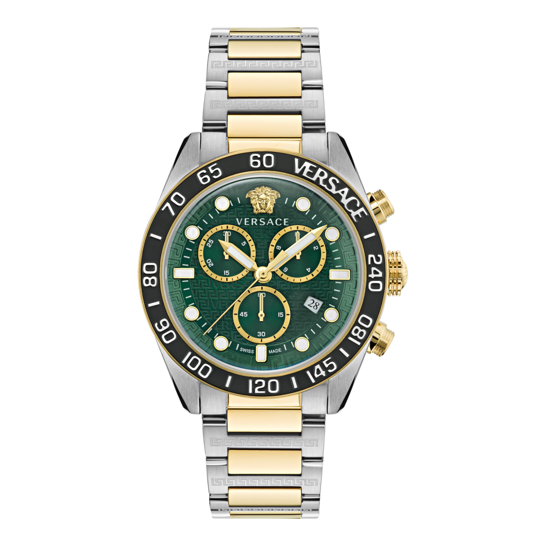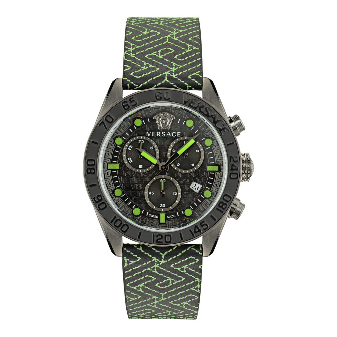 Greca Dome 男式腕表系列推出新款设计,采用圆顶表镜。Greca Dome Chrono 腕表采用 43 毫米直径表壳,搭配三计时盘,顶圈印有轨道式分钟刻度。这些细节设计与 3D 美杜莎头像和 Versace 标识等标志性图案相得益彰。