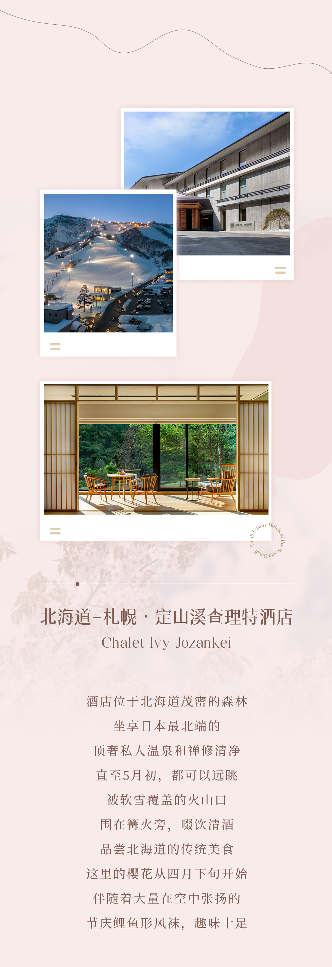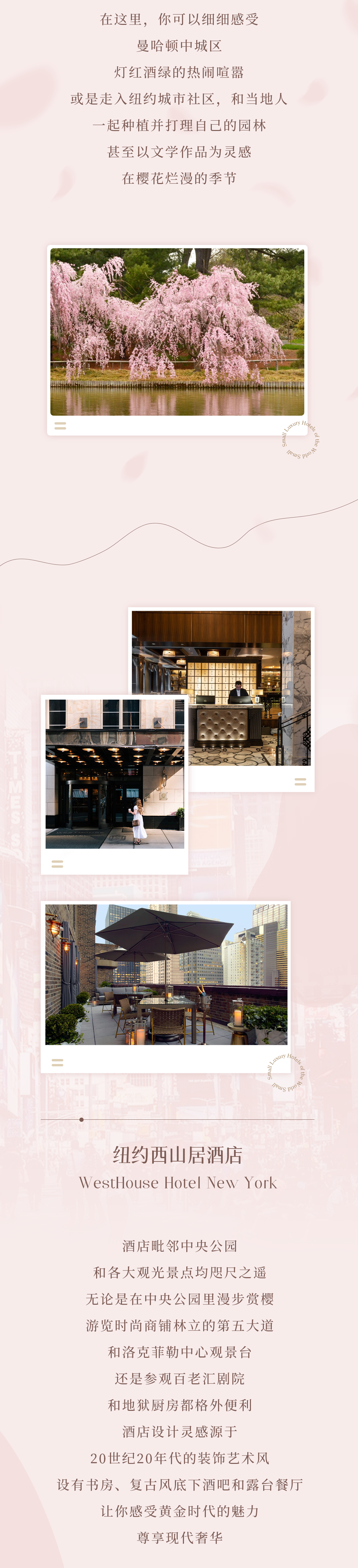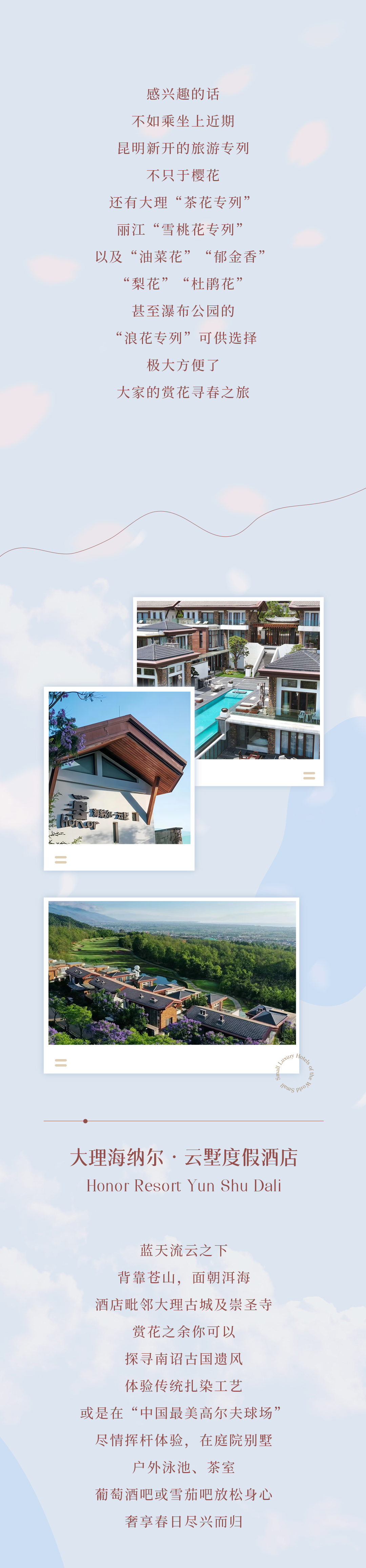 春日窃语,人面花映红 摘要:SLH与你共赏樱花假期 3月始,立春的日子 随着那些或是深红、浅红 或粉或白的花瓣随风飘落耳旁 在世界各地樱花季的盛典中 人们的生活突然浪漫地凭添了 更多窃窃私语的小情绪 “one more time,one more chance。” “呐,据说是秒速五厘米。” “嗯?什么?” “樱花花瓣飘落的速度, 是秒速五厘米。” 这一次,没有遗憾 而是带上赏春的期待 踏上樱花列车出发吧 1. 云南新增赏花专列 中国“春城”云南 樱花之美不输于日本 无论是在古城和普济寺的山野 还是云南大学和大理大学的校园沿路 甚至是雪山脚下的樱花大道都花海如潮 争相绽放的樱花层层叠叠,或零星散落 都沉浸在一片氤氲的花海中 令人心旷神怡 感兴趣的话,不如乘坐上近期 昆明新开的旅游专列,不只于樱花 还有大理“茶花专列”、丽江“雪桃花专列” 以及“油菜花”“郁金香”“梨花”“杜鹃花” 甚至瀑布公园的“浪花专列”可供选择 极大方便了大家的赏花寻春之旅 1.1大理海纳尔·云墅度假酒店Honor Resort Yun Shu Dali 蓝天流云之下,背靠苍山,面朝洱海。酒店毗邻大理古城及崇圣寺,赏花之余你可以探寻南诏古国遗风,体验传统扎染工艺,或是在“中国最美高尔夫球场” 尽情挥杆体验,在庭院别墅、户外泳池、茶室、葡萄酒吧或雪茄吧放松身心,奢享春日尽兴而归。 1.2大理巍山·颐和耘熹进士第The Dawn of Yihe Hotel 走进大理深山处的千年古城——巍山,这座三进四院的进士老宅再次成为传世作品。酒店菲芳院的庭畔樱花、古梅树丰姿正好。闲暇时,不妨跟随管家去尝一尝冻豆卷和红糖米花茶等小食,逛逛古树园和壁画,体验制香、扎染或是穿上传统彝族服装穿街走巷去。 1.3昆明玉龙湾湖景酒店Yulongwan Lakeview Hotel 酒店坐落于玉龙湾康谷,有着超大落地窗和开放式景观阳台,紧邻的白鹭半岛草坪面积约 1700㎡:波光粼粼,薄雾缭绕间让人陶醉,你可以体验高尔夫、网球、骑马、户外徒步、水上运动或是去游逛周边安宁温泉、滇池等旅游景点,同赏喜山乐水的休闲雅致。 2. 日本樱花祭 日本,被称为“樱之国度” 每年3~5月樱花祭格外受欢迎 各处都弥漫着樱花的味道 由于日本全岛地形狭长, 南北温差大,花期时间也各不相同 最早的花期是1~2月最南端的冲绳 可以一边冲浪、浮潜,看樱花飘落 中部的东京周边,约是3月中下旬 你可以呆坐市中心的街巷或是神社树下 也可以乘坐屋形船、划着小船欣赏 河川两旁白日盛开的樱花和夜景 直至北海道5月荼蘼盛放的晚樱 不妨泡着温泉一边赏雪,一边赏樱 一时竟分不清是雪,还是花 2.1东京-目黑川·雅叙园东京酒店Hotel Gajoen Tokyo 酒店邻近樱花观赏名地目黑川,运河两岸花灯树影摇曳,美不胜收。这里主打自然清寂之美,被誉为“龙神宫”,极具昭和时代的华丽装饰特色。你可以欣赏古典的传统艺术画廊,去明治神宫挂上一片许愿的木牌,看看代代木公园里野餐的人们,或是探索灯火通明的小巷清酒吧、歌舞伎町一番街等日本现代都市文化的缩影。 2.2北海道-札幌·定山溪查理特酒店Chalet Ivy Jozankei 酒店位于北海道茂密的森林,坐享日本最北端的顶奢私人温泉和禅修清净。直至5月初,都可以远眺被软雪覆盖的火山口,围在篝火旁,啜饮清酒,品尝北海道的传统美食。这里的樱花从四月下旬开始,伴随着大量在空中张扬的节庆鲤鱼形风袜,趣味十足。 3. 荷兰即将迎来750周年庆典 每年三月底到四月初 荷兰阿姆斯特丹的樱花季 最受欢迎的是市区的 Wester Park 和近郊的Amsterdamse Bos森林公园 此时,这里的郁金香花期也正盛 纵横的花田,交错的河道,巍然的风车 组成了荷兰独一无二的异域情调 直至4月下旬盛大的国王节人潮涌动 以及2025年即将到来的750年庆典 整座城市想必会格外热闹 3.1运河酒店Canal House 酒店位于阿姆斯特丹市中心皇帝运河 (Keizersgracht Canal)河畔,这里曾是十七世纪荷兰商人的聚集地,甚至于首次圣多纳特斯 (St. Donatus) 纪念活动就在酒店门口举行。闲暇时,你可以细细观赏室内墙上的艺术画作、在花园小酌,或是步行至普伊 (Spui) 市中心和水坝广场 (Dam Squares)。 3.2二十七号酒店TwentySeven Hotel 酒店位于阿姆斯特丹市中心人潮涌动的水坝广场(Damn square)上,俯瞰著名的皇宫、新教堂和国家纪念碑。酒店设有米其林星级餐厅和16间套房,特别推荐屋顶舞台套房,有着好风景和华丽的陈设的窗台是热门打卡点,非常适合晚礼服、香槟、节庆派对和约会,氛围感满满。 4. 纽约客的赏樱好去处 每年3月下旬开始 中央公园和布鲁克林植物园 是众多纽约客们赏樱的钟爱之地 在这里,你可以细细感受 曼哈顿中城区灯红酒绿的热闹喧嚣 或是走入纽约城市社区,和当地人 一起种植并打理自己的园林 甚至以文学作品为灵感 在樱花烂漫的季节 感受浓厚春意 4.1 纽约西山居酒店WestHouse Hotel New York 酒店毗邻中央公园,和各大观光景点均咫尺之遥。无论是在中央公园里漫步赏樱、游览时尚商铺林立的第五大道和洛克菲勒中心观景台,还是参观百老汇剧院和地狱厨房都格外便利。酒店设计灵感源于20世纪20年代的的装饰艺术风,设有书房、复古风底下酒吧和露台餐厅,让你感受黄金时代的魅力,尊享现代奢华。 4.2 纽约弗雷德瑞克酒店The Frederick Hotel 酒店有着源自19世纪30年代旧式纽约风格的庄严外观,如今成为了置身市中心的时尚、文化和美食潮流之地。这里位于繁荣