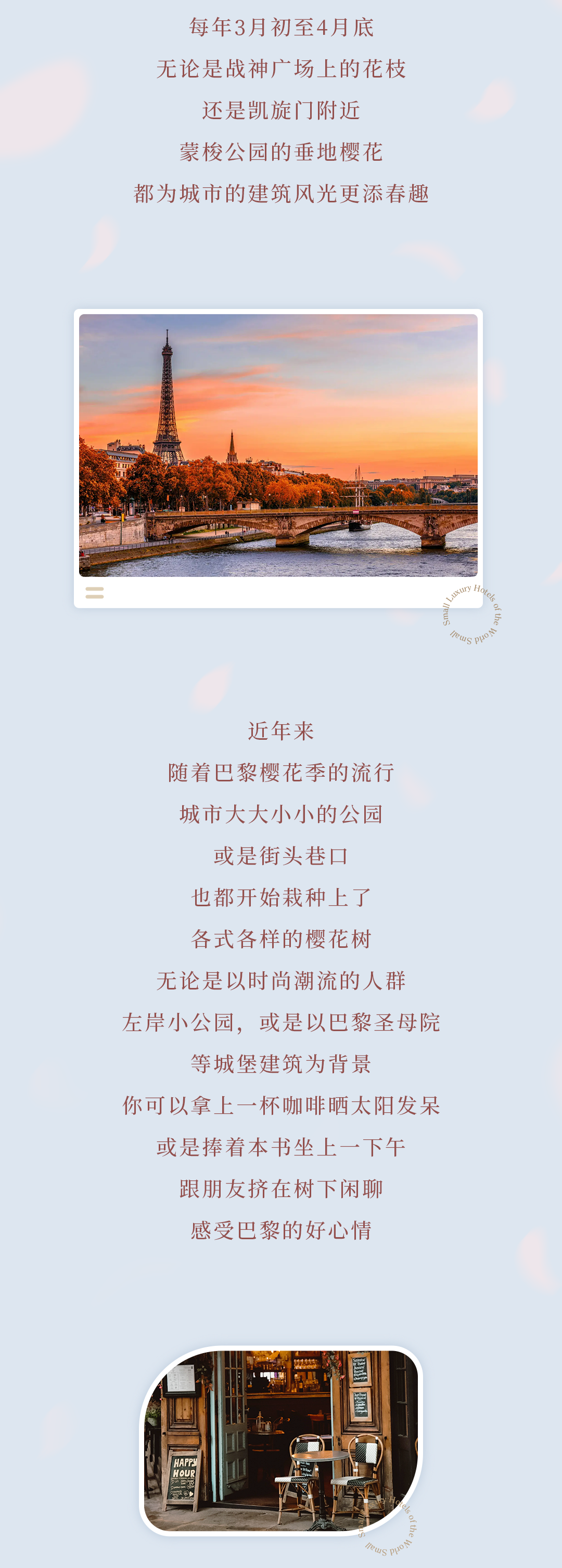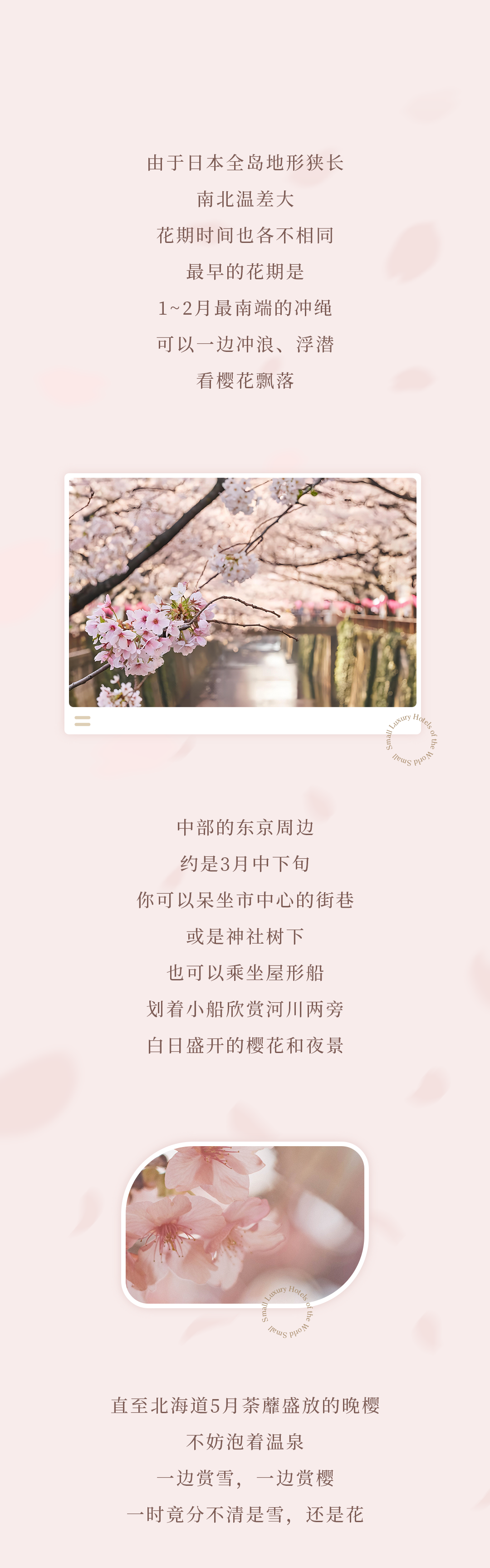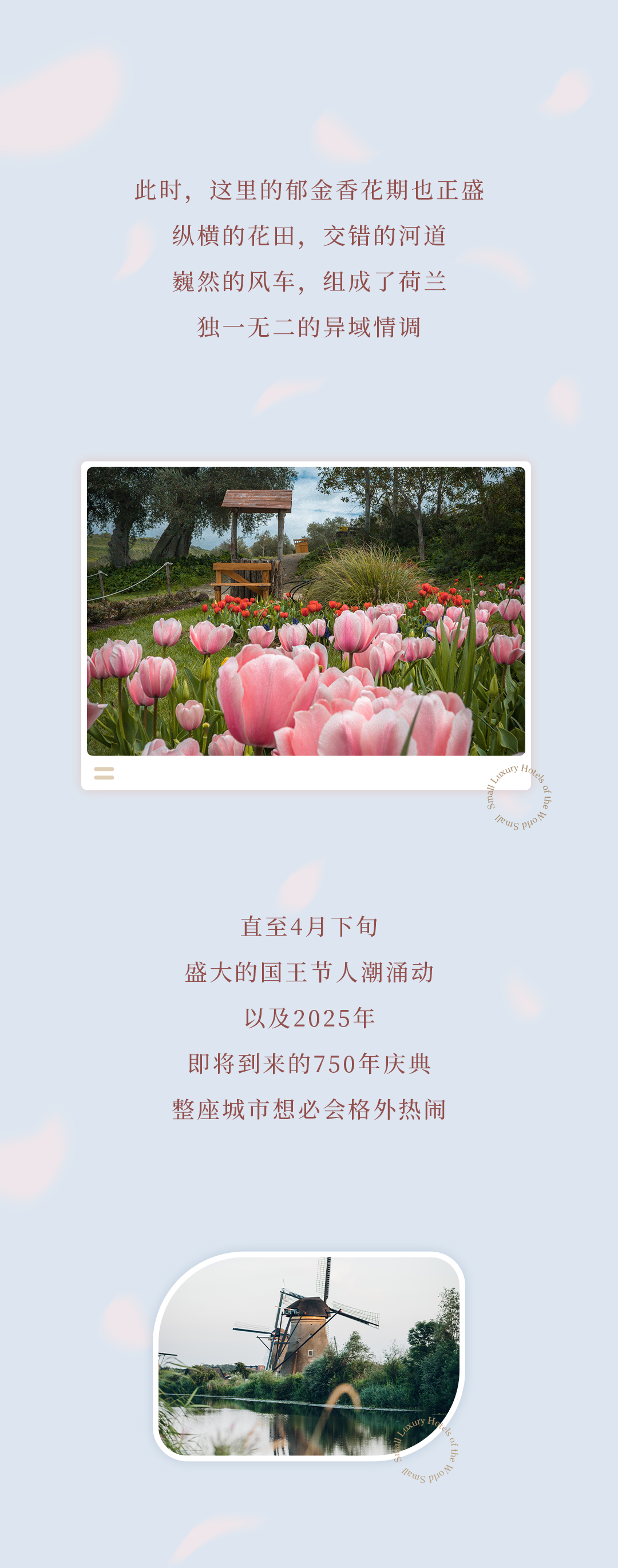 春日窃语,人面花映红 摘要:SLH与你共赏樱花假期 3月始,立春的日子 随着那些或是深红、浅红 或粉或白的花瓣随风飘落耳旁 在世界各地樱花季的盛典中 人们的生活突然浪漫地凭添了 更多窃窃私语的小情绪 “one more time,one more chance。” “呐,据说是秒速五厘米。” “嗯?什么?” “樱花花瓣飘落的速度, 是秒速五厘米。” 这一次,没有遗憾 而是带上赏春的期待 踏上樱花列车出发吧 1. 云南新增赏花专列 中国“春城”云南 樱花之美不输于日本 无论是在古城和普济寺的山野 还是云南大学和大理大学的校园沿路 甚至是雪山脚下的樱花大道都花海如潮 争相绽放的樱花层层叠叠,或零星散落 都沉浸在一片氤氲的花海中 令人心旷神怡 感兴趣的话,不如乘坐上近期 昆明新开的旅游专列,不只于樱花 还有大理“茶花专列”、丽江“雪桃花专列” 以及“油菜花”“郁金香”“梨花”“杜鹃花” 甚至瀑布公园的“浪花专列”可供选择 极大方便了大家的赏花寻春之旅 1.1大理海纳尔·云墅度假酒店Honor Resort Yun Shu Dali 蓝天流云之下,背靠苍山,面朝洱海。酒店毗邻大理古城及崇圣寺,赏花之余你可以探寻南诏古国遗风,体验传统扎染工艺,或是在“中国最美高尔夫球场” 尽情挥杆体验,在庭院别墅、户外泳池、茶室、葡萄酒吧或雪茄吧放松身心,奢享春日尽兴而归。 1.2大理巍山·颐和耘熹进士第The Dawn of Yihe Hotel 走进大理深山处的千年古城——巍山,这座三进四院的进士老宅再次成为传世作品。酒店菲芳院的庭畔樱花、古梅树丰姿正好。闲暇时,不妨跟随管家去尝一尝冻豆卷和红糖米花茶等小食,逛逛古树园和壁画,体验制香、扎染或是穿上传统彝族服装穿街走巷去。 1.3昆明玉龙湾湖景酒店Yulongwan Lakeview Hotel 酒店坐落于玉龙湾康谷,有着超大落地窗和开放式景观阳台,紧邻的白鹭半岛草坪面积约 1700㎡:波光粼粼,薄雾缭绕间让人陶醉,你可以体验高尔夫、网球、骑马、户外徒步、水上运动或是去游逛周边安宁温泉、滇池等旅游景点,同赏喜山乐水的休闲雅致。 2. 日本樱花祭 日本,被称为“樱之国度” 每年3~5月樱花祭格外受欢迎 各处都弥漫着樱花的味道 由于日本全岛地形狭长, 南北温差大,花期时间也各不相同 最早的花期是1~2月最南端的冲绳 可以一边冲浪、浮潜,看樱花飘落 中部的东京周边,约是3月中下旬 你可以呆坐市中心的街巷或是神社树下 也可以乘坐屋形船、划着小船欣赏 河川两旁白日盛开的樱花和夜景 直至北海道5月荼蘼盛放的晚樱 不妨泡着温泉一边赏雪,一边赏樱 一时竟分不清是雪,还是花 2.1东京-目黑川·雅叙园东京酒店Hotel Gajoen Tokyo 酒店邻近樱花观赏名地目黑川,运河两岸花灯树影摇曳,美不胜收。这里主打自然清寂之美,被誉为“龙神宫”,极具昭和时代的华丽装饰特色。你可以欣赏古典的传统艺术画廊,去明治神宫挂上一片许愿的木牌,看看代代木公园里野餐的人们,或是探索灯火通明的小巷清酒吧、歌舞伎町一番街等日本现代都市文化的缩影。 2.2北海道-札幌·定山溪查理特酒店Chalet Ivy Jozankei 酒店位于北海道茂密的森林,坐享日本最北端的顶奢私人温泉和禅修清净。直至5月初,都可以远眺被软雪覆盖的火山口,围在篝火旁,啜饮清酒,品尝北海道的传统美食。这里的樱花从四月下旬开始,伴随着大量在空中张扬的节庆鲤鱼形风袜,趣味十足。 3. 荷兰即将迎来750周年庆典 每年三月底到四月初 荷兰阿姆斯特丹的樱花季 最受欢迎的是市区的 Wester Park 和近郊的Amsterdamse Bos森林公园 此时,这里的郁金香花期也正盛 纵横的花田,交错的河道,巍然的风车 组成了荷兰独一无二的异域情调 直至4月下旬盛大的国王节人潮涌动 以及2025年即将到来的750年庆典 整座城市想必会格外热闹 3.1运河酒店Canal House 酒店位于阿姆斯特丹市中心皇帝运河 (Keizersgracht Canal)河畔,这里曾是十七世纪荷兰商人的聚集地,甚至于首次圣多纳特斯 (St. Donatus) 纪念活动就在酒店门口举行。闲暇时,你可以细细观赏室内墙上的艺术画作、在花园小酌,或是步行至普伊 (Spui) 市中心和水坝广场 (Dam Squares)。 3.2二十七号酒店TwentySeven Hotel 酒店位于阿姆斯特丹市中心人潮涌动的水坝广场(Damn square)上,俯瞰著名的皇宫、新教堂和国家纪念碑。酒店设有米其林星级餐厅和16间套房,特别推荐屋顶舞台套房,有着好风景和华丽的陈设的窗台是热门打卡点,非常适合晚礼服、香槟、节庆派对和约会,氛围感满满。 4. 纽约客的赏樱好去处 每年3月下旬开始 中央公园和布鲁克林植物园 是众多纽约客们赏樱的钟爱之地 在这里,你可以细细感受 曼哈顿中城区灯红酒绿的热闹喧嚣 或是走入纽约城市社区,和当地人 一起种植并打理自己的园林 甚至以文学作品为灵感 在樱花烂漫的季节 感受浓厚春意 4.1 纽约西山居酒店WestHouse Hotel New York 酒店毗邻中央公园,和各大观光景点均咫尺之遥。无论是在中央公园里漫步赏樱、游览时尚商铺林立的第五大道和洛克菲勒中心观景台,还是参观百老汇剧院和地狱厨房都格外便利。酒店设计灵感源于20世纪20年代的的装饰艺术风,设有书房、复古风底下酒吧和露台餐厅,让你感受黄金时代的魅力,尊享现代奢华。 4.2 纽约弗雷德瑞克酒店The Frederick Hotel 酒店有着源自19世纪30年代旧式纽约风格的庄严外观,如今成为了置身市中心的时尚、文化和美食潮流之地。这里位于繁荣