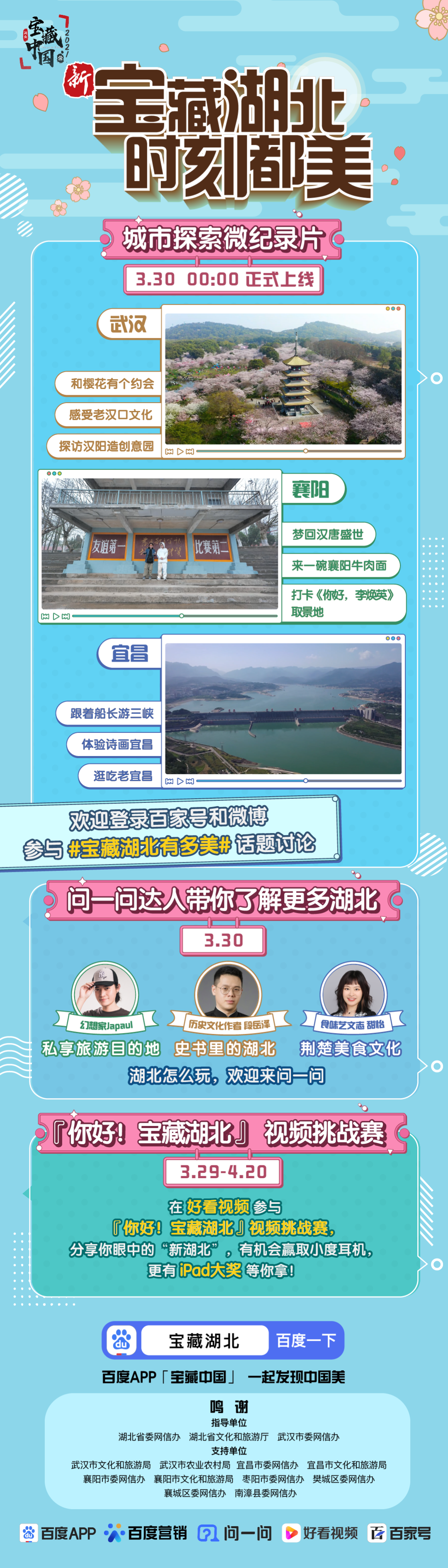 助力计划中,全新升级的「宝藏湖北」项目在今天率先上线,我们见证湖北和春天的美好约定,通过城市探索微纪录片、问一问达人知识直播、好看视频「你好!宝藏湖北」视频挑战赛、百家号话题等丰富的形式,打造了一场线上线下结合、百度系内容生态矩阵联动的城市盛宴,邀请全国网民一起探索湖北宝藏之美!