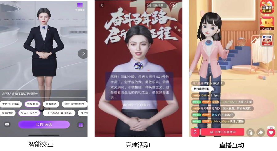 左图为基于数字人驱动技术,手机实时捕捉员工表情及动作;右图为客户使用虚拟形象向数字人理财经理进行视频咨询。