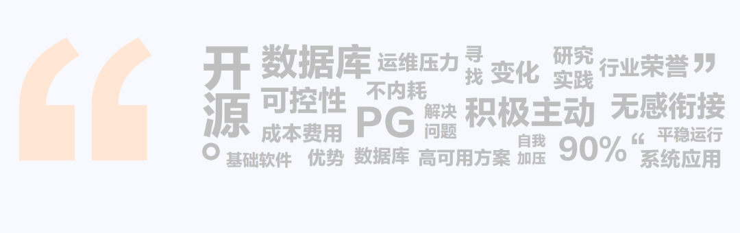2017年,我们开始探索PG库,2019年大规模推广使用。目前包括手机银行在内,全行近90%的系统都应用了PG库,我行成为业内使用PG库最广泛的大行之一。