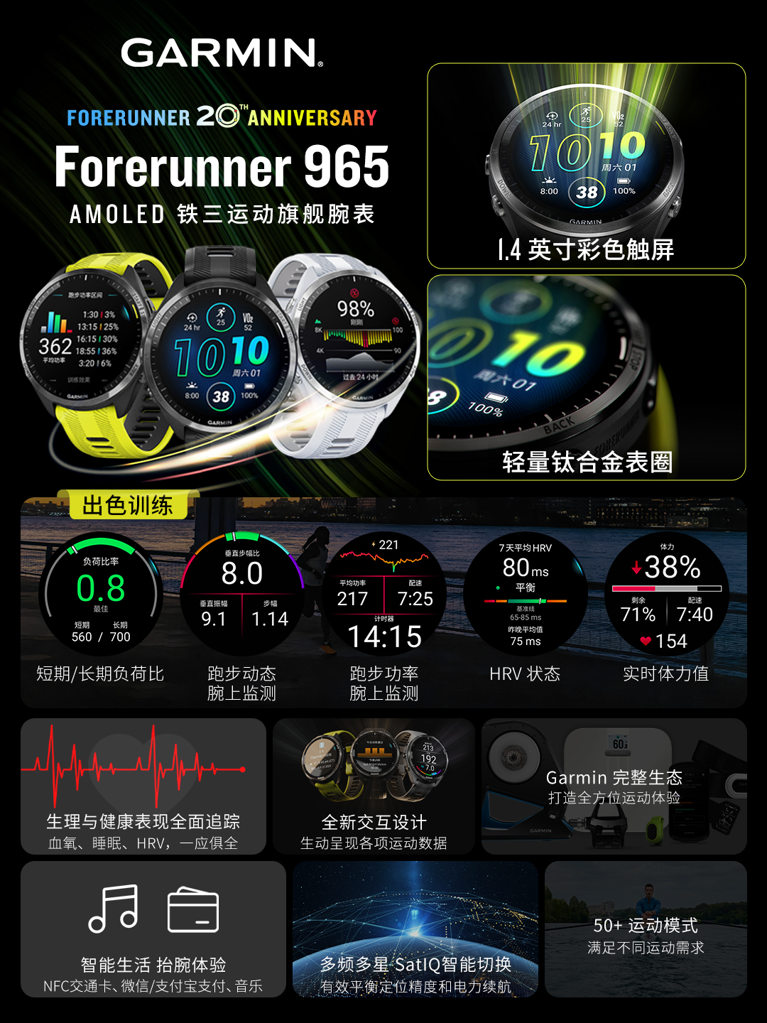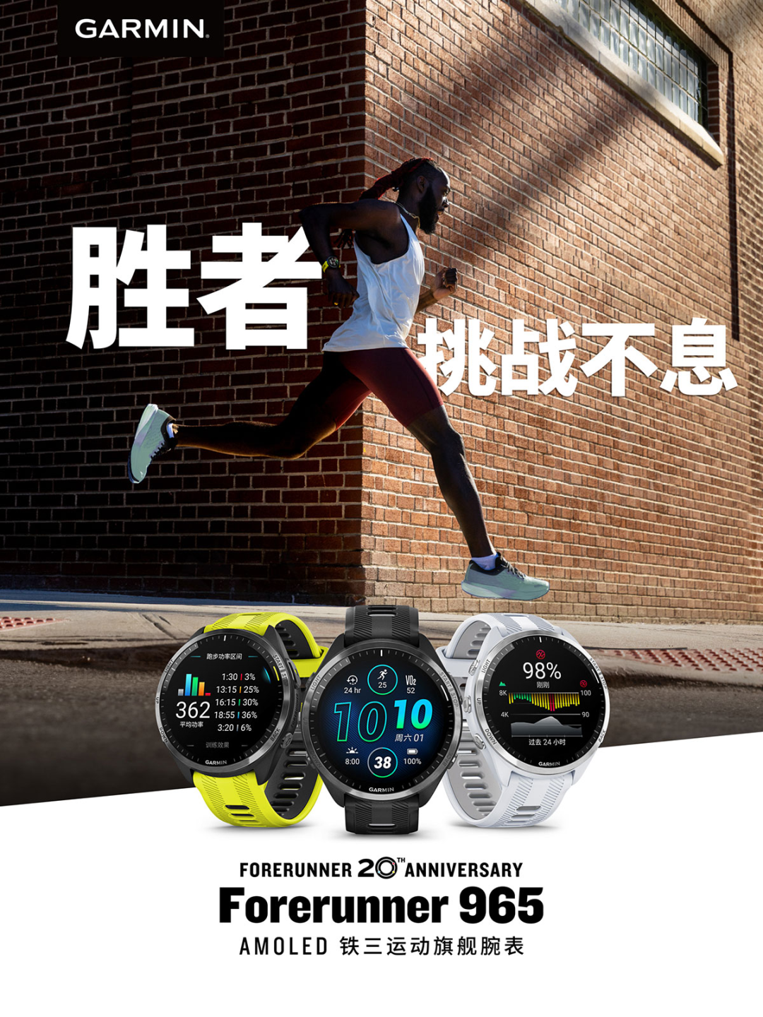 为何不让你的每一次跑步都是最佳表现?并通过训练准备程度知道自己何时处于夺得胜利的最佳状态?佩戴 FORERUNNER 965 智能手表,通过色彩鲜艳的 AMOLED 屏幕查看各项数据。很快,你就能赢得荣耀。