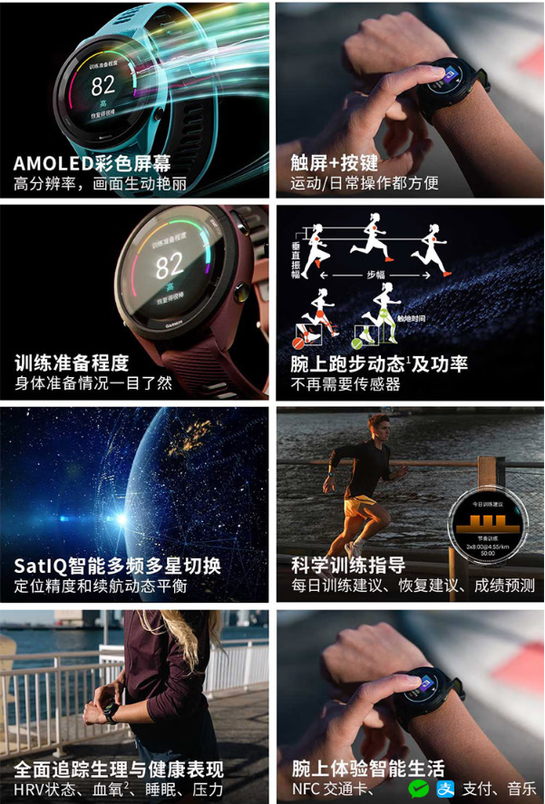 全面升级AMOLED,触屏全天候健康监测+科学训练指导,陪你穿梭在城市的大街小巷让生活精彩运动出彩,跑步-恢复-训练不间断,智能模式续航可达13天,多种配色可选,策略规划,赛事助手,每日训练建议,训练准备程度。