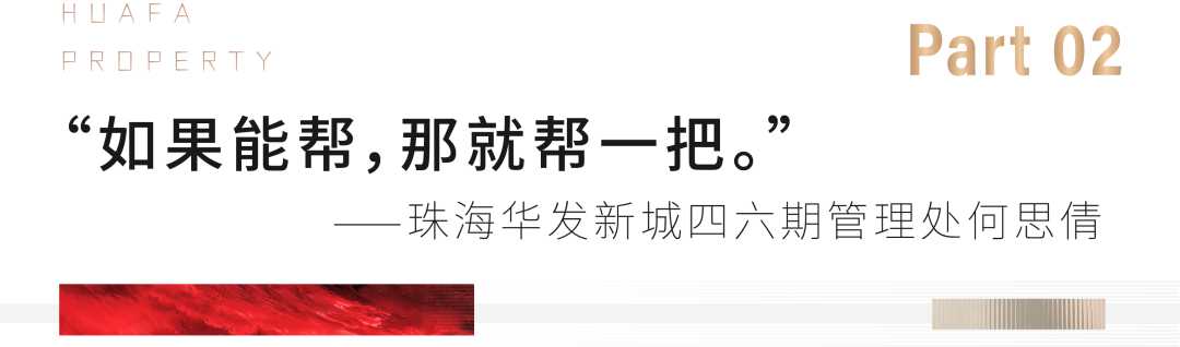“其实当时的情况特别简单,这对我们来说,只是一件随手帮忙的小事。看到别人有需要就去帮忙,这是华发物业人都有的习惯。”回想起当时的经历,何思倩并没有觉得有什么特殊的地方。华发物业持续弘扬的正气文化早已浸润人心,像这样随手帮忙的小事,几乎每天都在发生,“但是这一次,我们也想谢谢这些业主,给了我们温暖的回应。”