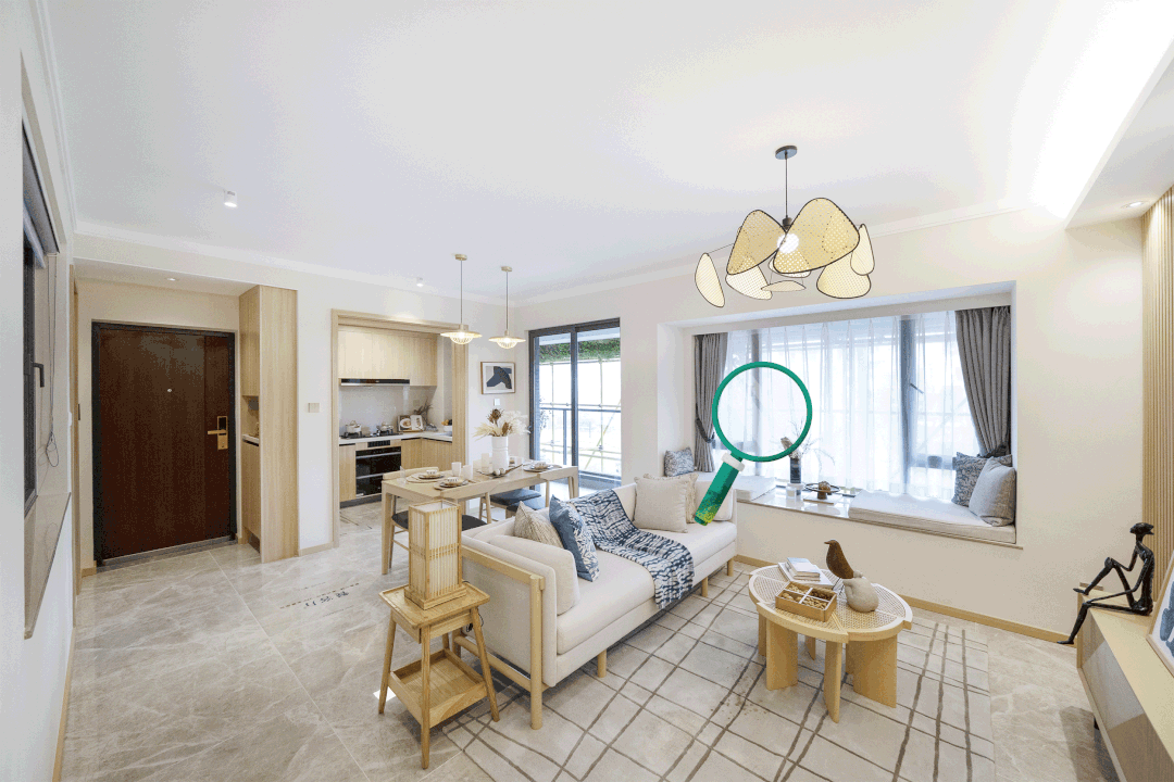室内空间以中式淡雅风格为主,搭配精致的木制家具和整洁透亮的大理石地板,打造出简约通透的室内格局。宽敞的飘窗设计,打通室内与山水的链接,让居住空间向山水延伸,让我们收获如诗画般的山海生活。