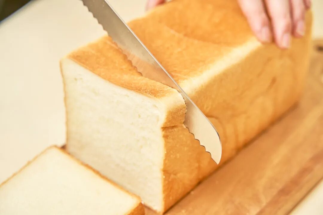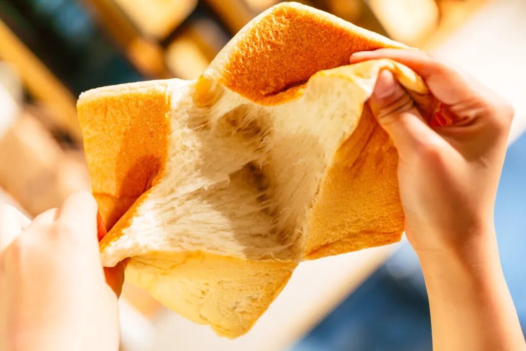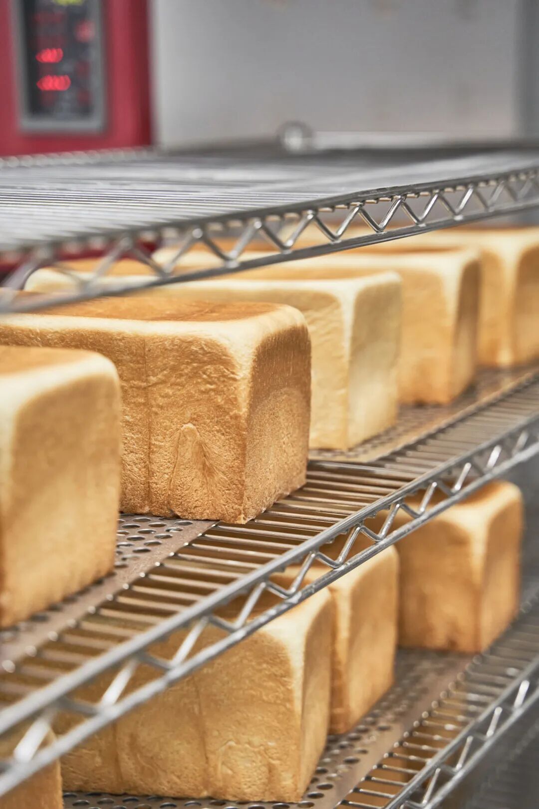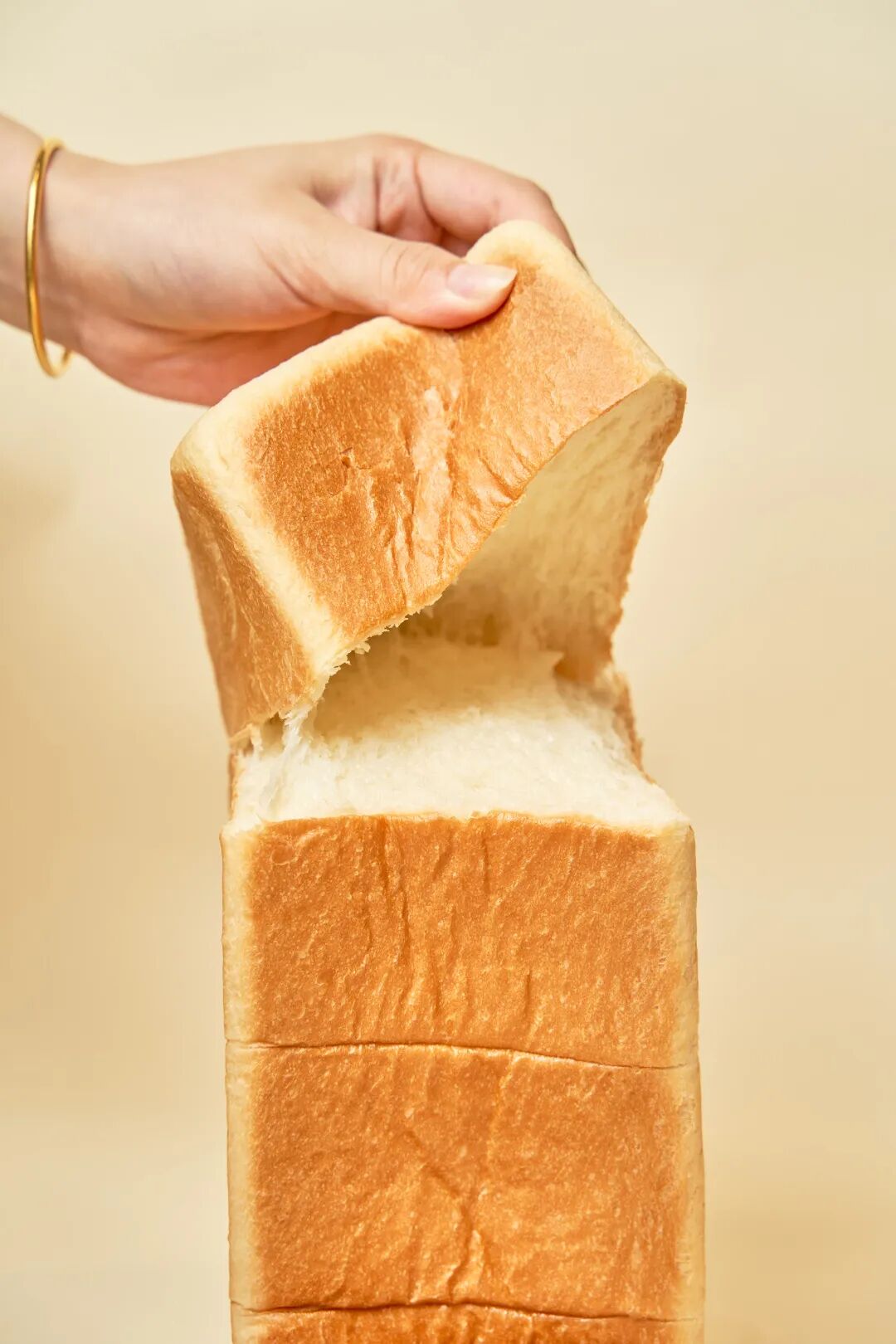 不同于一般的碱性面包,银座仁志川使用了独特的碱性离子水和神秘的自研面粉来制作吐司。师傅会根据天气温度和湿度来计算吸水率和发酵时间,让吐司更加微甜柔软、绵润细致、回弹“三尺高”,就连面包边也滑如丝绸。