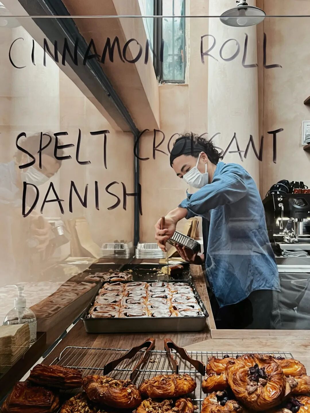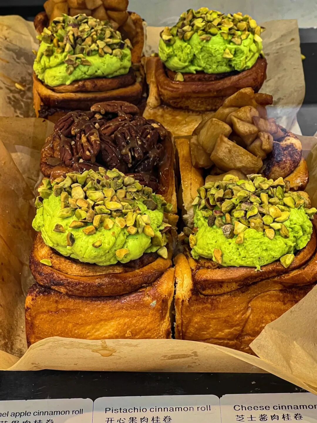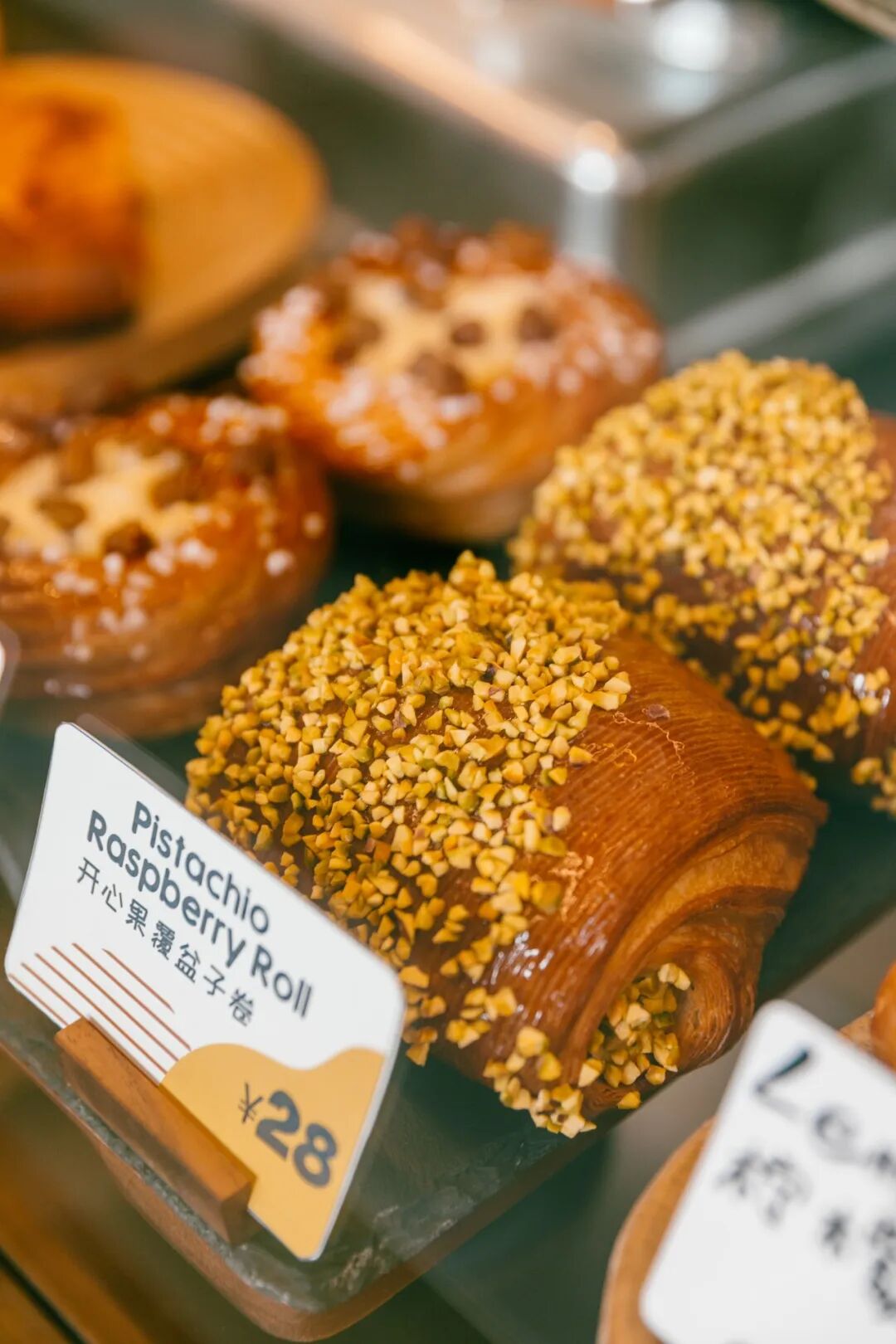 店内除了brunch之外,各式面包烘焙依旧选择丰富,最近风很大的开心果肉桂卷值得一试,足量的开心果奶油搭配甜蜜的肉桂卷,谁吃了都迷糊。