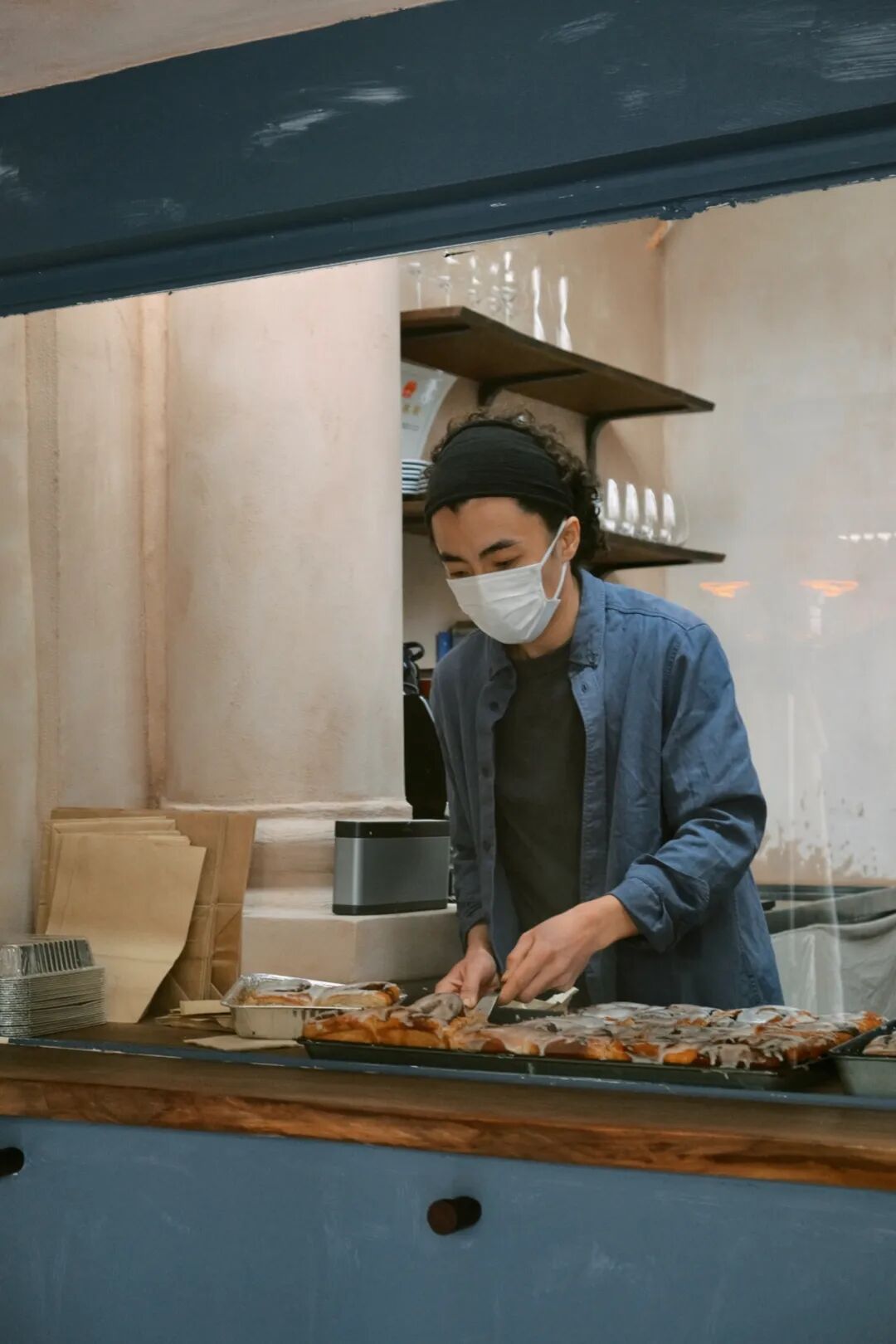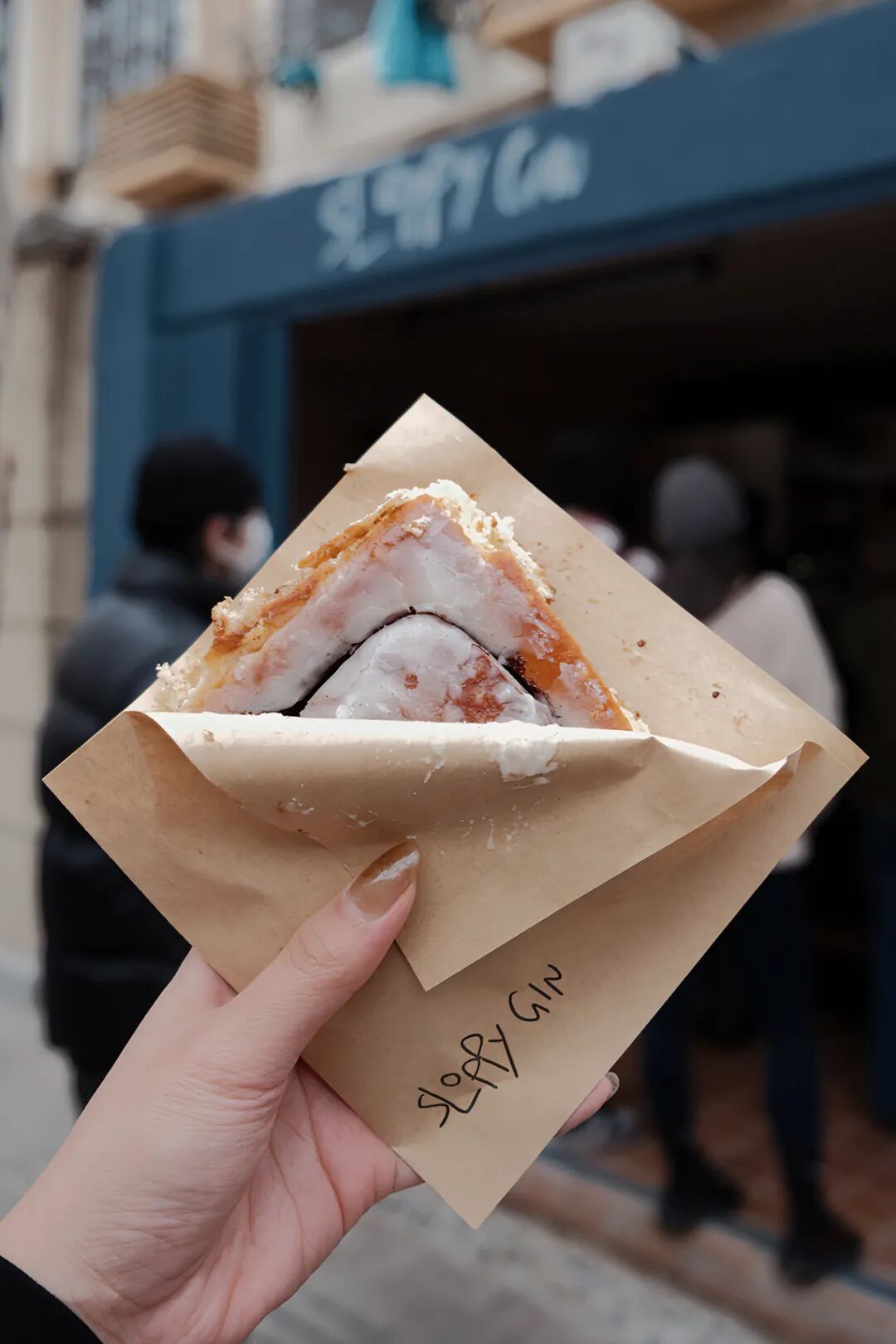 从开业火到现在的手作小店Sloppy Gin,工业风蓝色门头小众高级,店内售卖的单品也直接写在厨房的玻璃上,实在是有个性~他们家主打全自然酵母发酵的面包,肉桂卷、可颂、甜甜圈都有,推荐大家试试肉桂卷,面包香软富有嚼劲,肉桂量足香气浓郁,吃完一整个简直不要太满足!