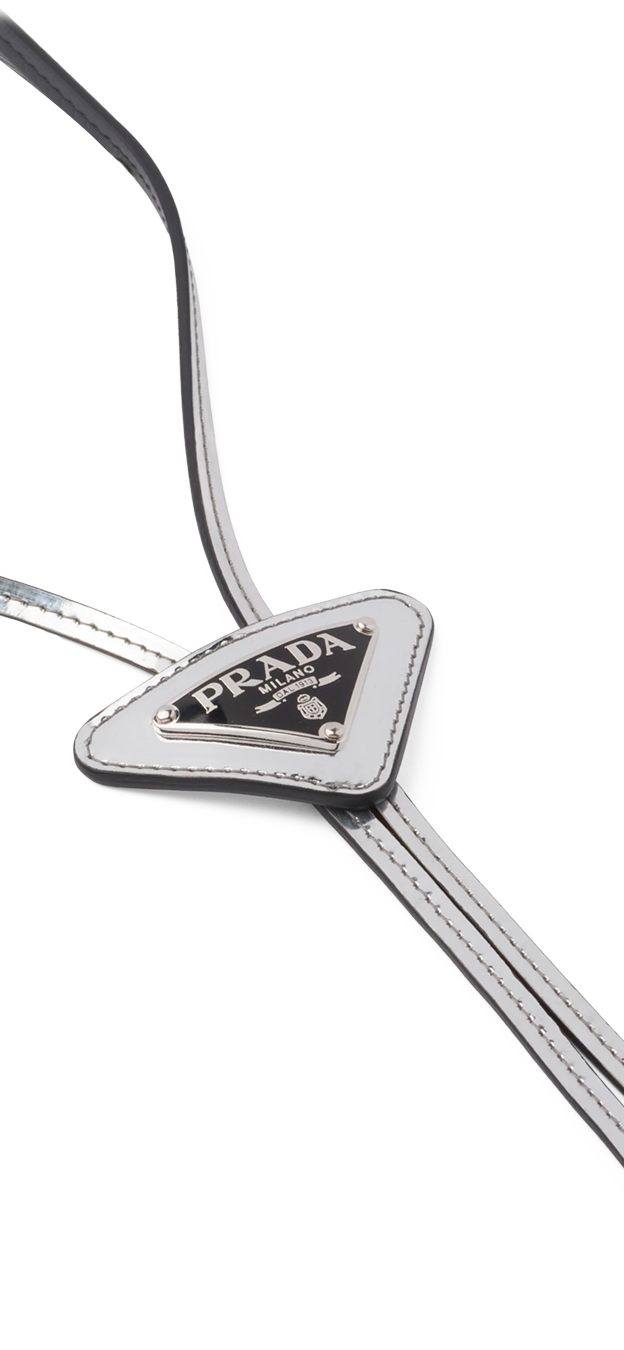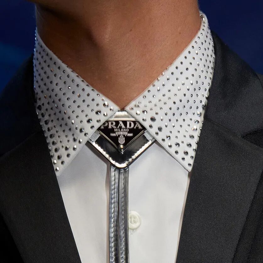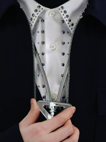 同样巧妙的还有这条Bolo领带,三角徽标可以上下滑动,想更正式就向上卡住领子,松开就是休闲的颈饰。
