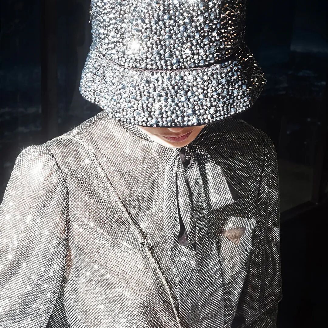 在不同角度光线的照射下,黑色水钻像点点繁星,大面积的黑色亮片仿佛月光下波光粼粼的湖面。