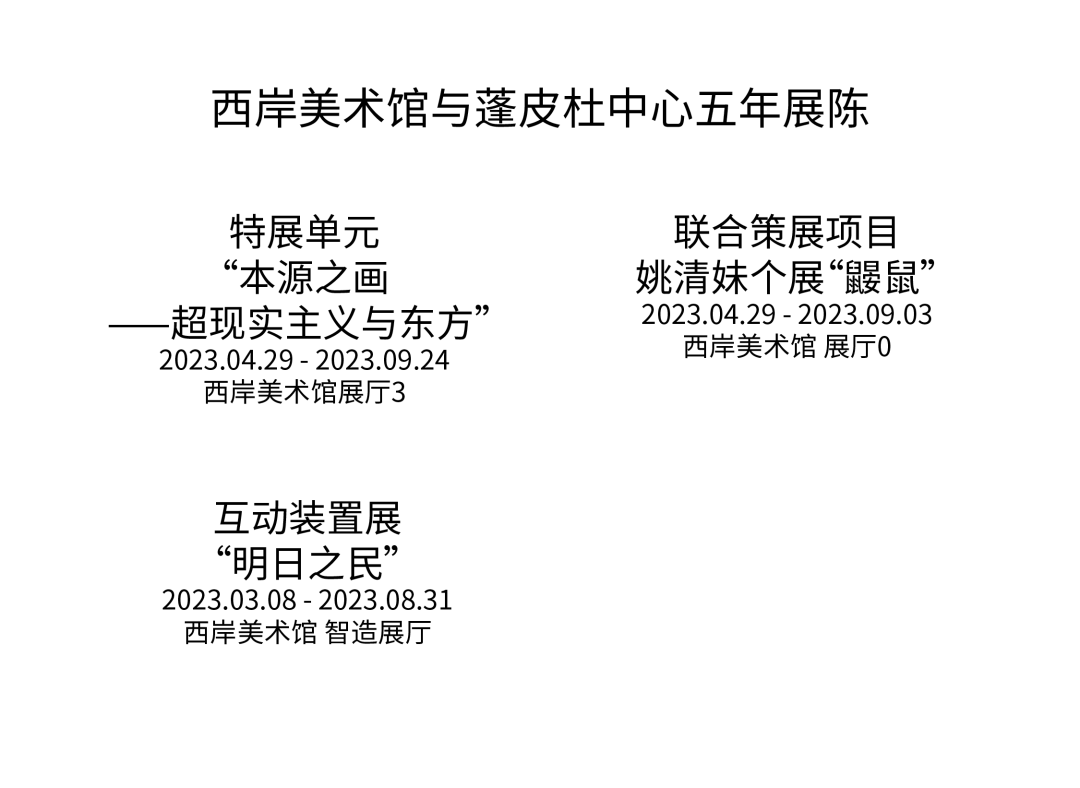 西岸美术馆致力于打造多元艺术生活方式。在这里,你将在特展“本源之画——超现实主义与东方”中体味超现实主义鲜为人知的一面,感悟古今中外的书画同源,开启东西方美学的深入交流;在互动装置展“明日之民”中遇见国际时尚大师、知名法国艺术家让-夏尔·德卡斯泰尔巴雅克的天马行空,享受没有年龄、文化和语言壁垒的欢畅交流;在姚清妹个展“鼹鼠”中感知当代艺术的先锋实验,透过作品进入另一个世界。此外,像素计划和书架项目亦将让我们在影像和文字中探索生活的多个维度与可能。