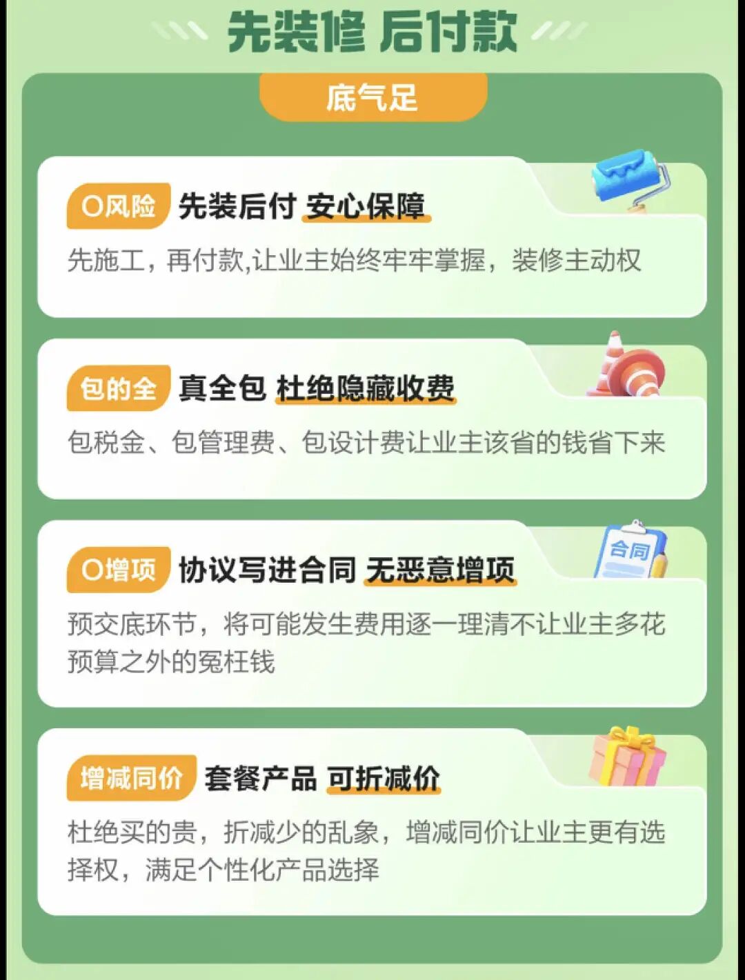 享受先装修后付装修款,装修主导权给到业主手里,从此告别主导权丧失导致的恶意增项和工期问题;