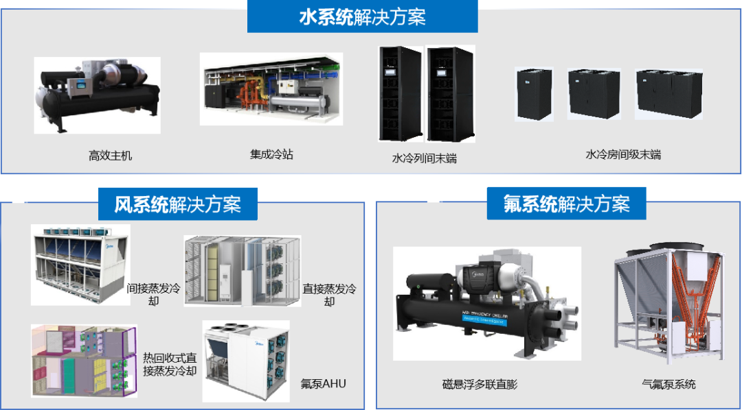 美的楼宇科技企划与技术管理模块负责人刘凯介绍,美的数据中心温控解决方案包括水系统解决方案、风系统解决方案以及氟系统解决方案。水系统方案主要利用高温水系统+高效末端、Freecooling风冷螺杆+高效末端的组合,建筑适应性较好,可满足长距离输送;风系统方案则采用间接蒸发冷却AHU或直接蒸发冷却AHU,需提前规划,确保建筑&设备和气流组织匹配;氟系统方案使用磁悬浮直冷,稳定性高,交付周期更短。目前,美的楼宇科技已为鹏城云脑Ⅱ超算中心、江门蔚海智谷数据中心、拉萨宁算数据中心等众多数据中心项目打造解决方案。