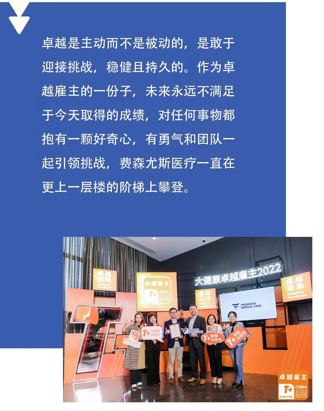 同时经过调研问卷、组委会提名、和评审委员会的综合意见,确定了费森尤斯医疗在“患者价值”方面独特的雇主价值。我们还获得了本次认证的特别奖项 - 卓越患者价值奖。