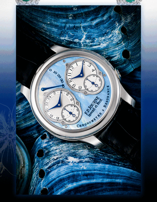 其中CHRONOMÈTRE À RÉSONANCE 2019 最终版,作为F.P. JOURNE 一款独一无二的珍藏款,诠释出品牌对细节的极致追求。同时,该腕表搭载了两地时间、共振式双独立擒纵系统、动力储存等功能,并采用了冰蓝色贝母表盘,为其增添一份优雅和奢华感。
