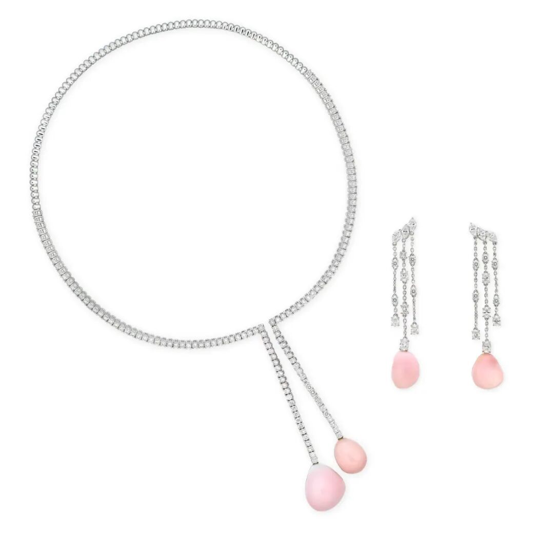 珍珠的一大迷人之处在于光洁表层下蕴藏着独具一格的光泽,而天然的海螺珍珠粉中带橙犹如鲜亮的火焰,让人着迷。天然海螺珍珠钻石项链及耳环唯美精致的造型设计呼应海螺珍珠明亮色彩,超具美学价值。
