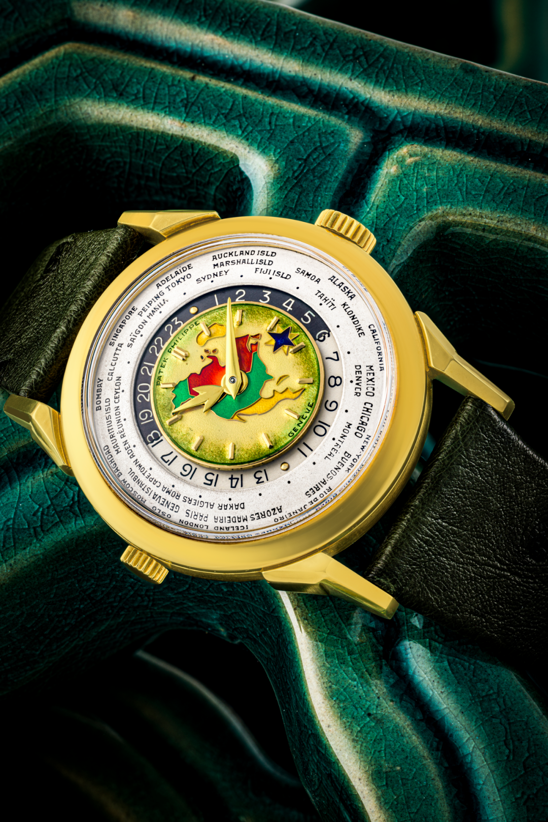 该腕表的表壳采用了18K黄金制作,结合1950年代超具个性的简约设计,尽显非凡魅力。配置的双表冠掐丝珐琅表盘,还可24小时显示和描绘北美洲地图。此外,这款腕表还具日期、月相、计时等多样功能,具有很高的收藏价值。