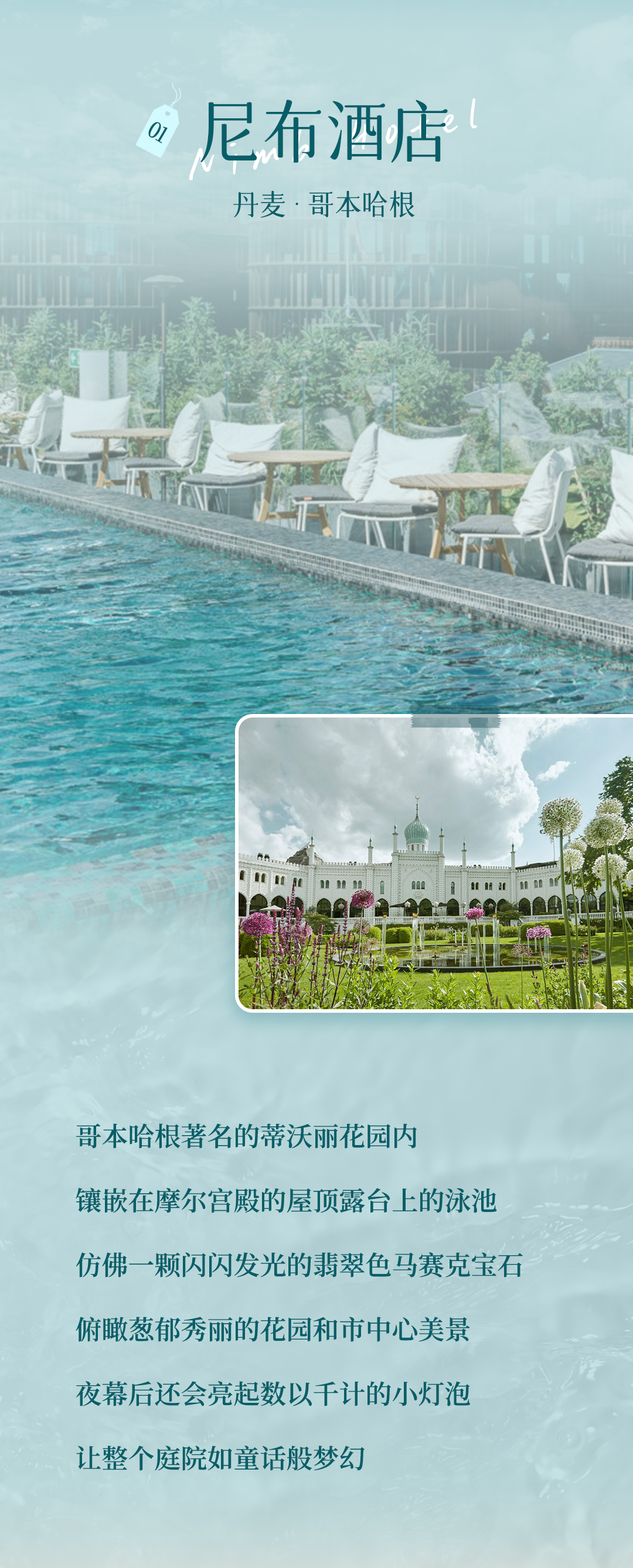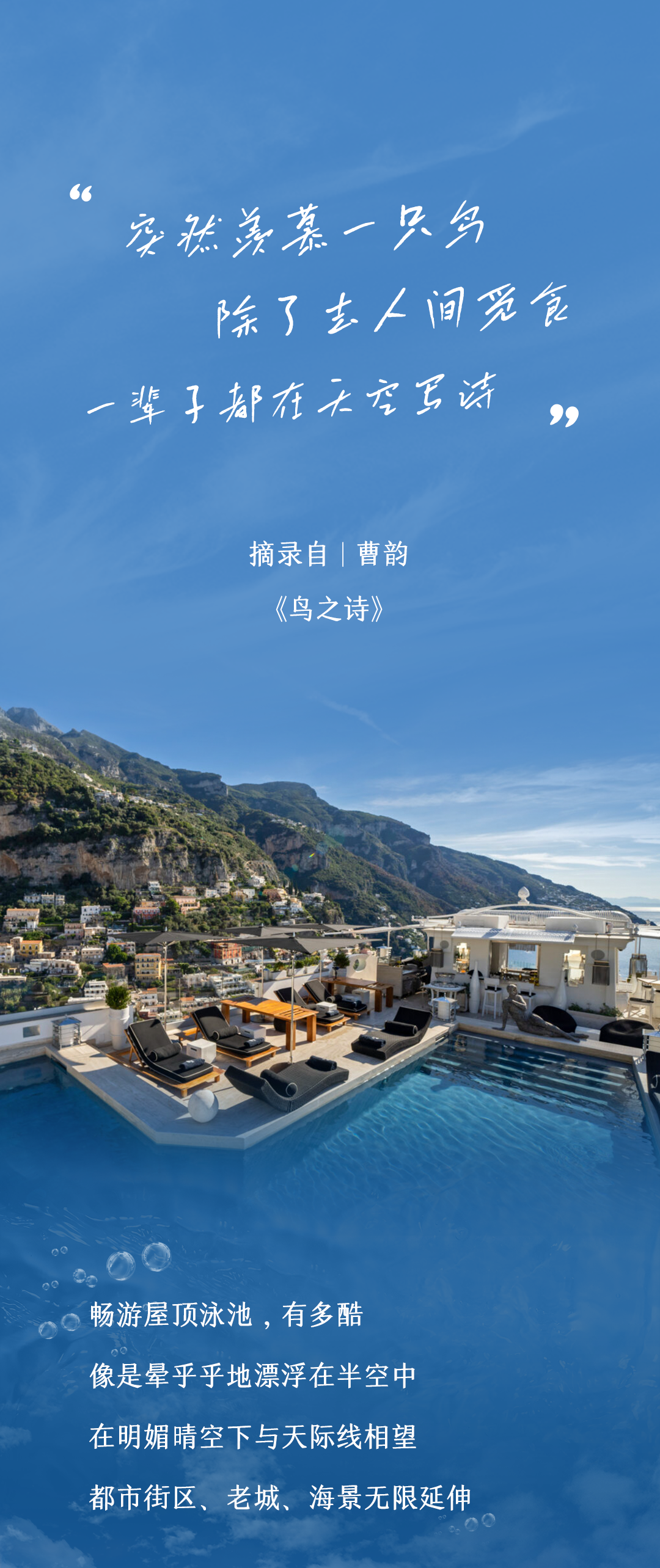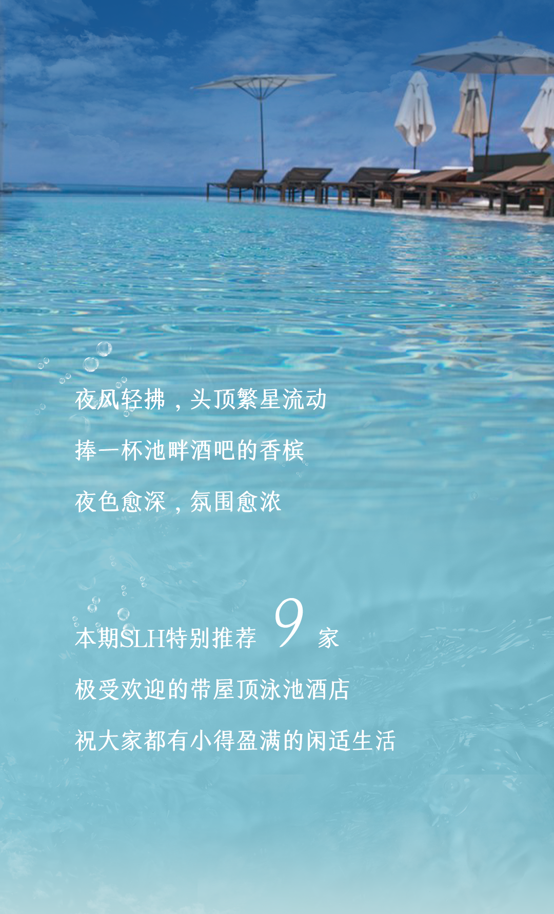 “突然羡慕一只鸟 除了去人间觅食 一辈子都在天空写诗” 摘录自 | 曹韵 《鸟之诗》 畅游屋顶泳池,有多酷?像是晕乎乎地漂浮在半空中, 在明媚晴空下与天际线相望, 都市街区、老城、海景无限延伸 …… 夜风轻拂,头顶繁星流动, 捧一杯池畔酒吧的香槟, 夜色愈深,氛围愈浓~ 本期SLH 特别推荐 9 家 极受欢迎的带屋顶泳池酒店 祝大家都有小得盈满的闲适生活~ 1尼布酒店 Nimb Hotel 丹麦·哥本哈根 哥本哈根著名的蒂沃丽花园内 镶嵌在摩尔宫殿的屋顶露台上的泳池 仿佛一颗闪闪发光的翡翠色马赛克宝石 俯瞰葱郁秀丽的花园和市中心美景 夜幕后还会亮起数以千计的小灯泡 让整个庭院如童话般梦幻 2. 埃米利亚诺里奥酒店 Emiliano Rio 巴西·里约热内卢 在科帕卡巴纳海滩上 当海风和阳光穿过百叶窗 为整个房间注满斑驳的光线和清凉 穿着哈瓦那人字拖慢悠悠走过花园餐厅 管家已安排好美味的早午餐和泳池沙滩躺椅 为你再现里约迷人的1950年代风情 3贝格斯酒店 Hotel Bagués 西班牙·巴塞罗那 市中心的商业购物区兰布拉大道上 这栋建于19世纪的 El Regulador 宫殿 曾是宝格丝-玛莎蕾尔家族珠宝作坊所在 如今酒店仍将其现代新艺术派珠宝作为装饰 你可以在屋顶泳池饱览巴塞罗那天际线美景 品尝西班牙特色小吃和桑格利亚汽泡酒 4弗兰卡别墅酒店 Villa Franca 意大利·波西塔诺 在山顶池畔的日光躺椅上欣赏 阿马尔菲海岸如明信片般的壮丽景色 在露台品尝鸡尾、新鲜海鲜和户外烧烤 或是漫步美丽的崖边小镇和热闹的海滩 沉醉于悠扬的钢琴乐声、电影和老式游戏 或是租一艘船和船长探秘迷人的那不勒斯湾 5卡塔赫纳印度莫维齐酒店 Movich Hotel Cartagena de Indias 哥伦比亚·卡塔赫纳 在历史名城卡塔赫纳 感受《霍乱时期的爱情》 眺望着加勒比海海岸风情 在空中酒吧、露台和屋顶泳池 微风中扑鼻而来的茉莉花香气里 尽情感悟自己对生活的热爱 6伊维萨阿加斯豪华大酒店 Aguas de Ibiza Grand Luxe Hotel 西班牙·伊比萨岛 伊比萨岛东海岸的圣埃乌拉利亚 迷失在各种风格的“白色梦境”中 日光下的泳池,俱乐部和花园露台 以自然风水为灵感的现代化陈设 营造了浓郁的夏日海边度假氛围 7卡萨殖民海岸温泉酒店 Casa Colonial Beach & Spa 多米尼加共和国·普拉塔港 琥珀海岸的金色沙滩和葱翠山脉 聆听着不远处静谧柔和的的海浪声 在这座殖民风建筑的屋顶无边泳池畔 享受水疗或跳水按摩浴缸,放松身心 眺望波光粼粼的加勒比海岸风光 8圣弗朗西斯科非凡酒店 Sant Francesc Hotel Singular 西班牙 帕尔马 帕尔马老城中心 19世纪的庄园宅邸 在近200平米的屋顶露台泳池畔 全天候啜饮冰镇香槟和招牌鸡尾酒 俯瞰壮观的帕尔马大教堂的城市绿洲 和桑特佛兰西斯可广场上熙攘的人群 9 特拉维夫诺曼酒店 The Norman Tel Aviv 以色列 特拉维夫 市中心这栋有着上百年历史的联排别墅 置身顶层无边泳池,饱览迷人落日景致 在露台遮阳伞下享受日光浴和按摩水疗 俯瞰令人耳目一新的包豪斯风格建筑群