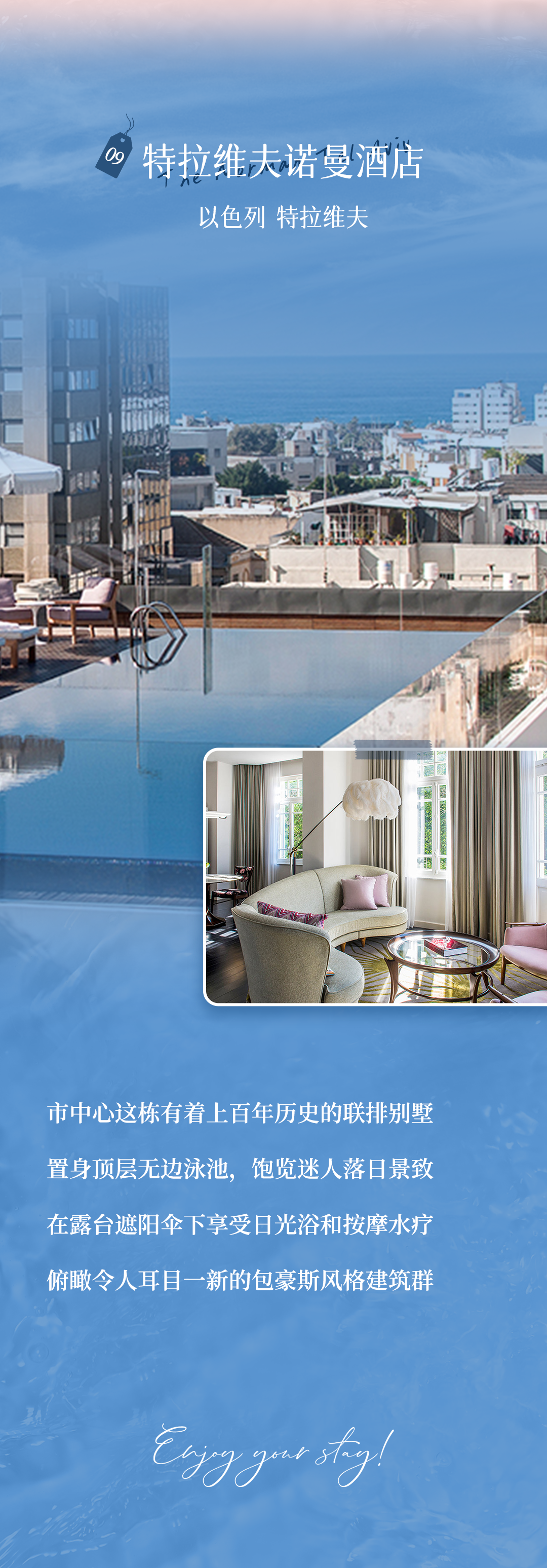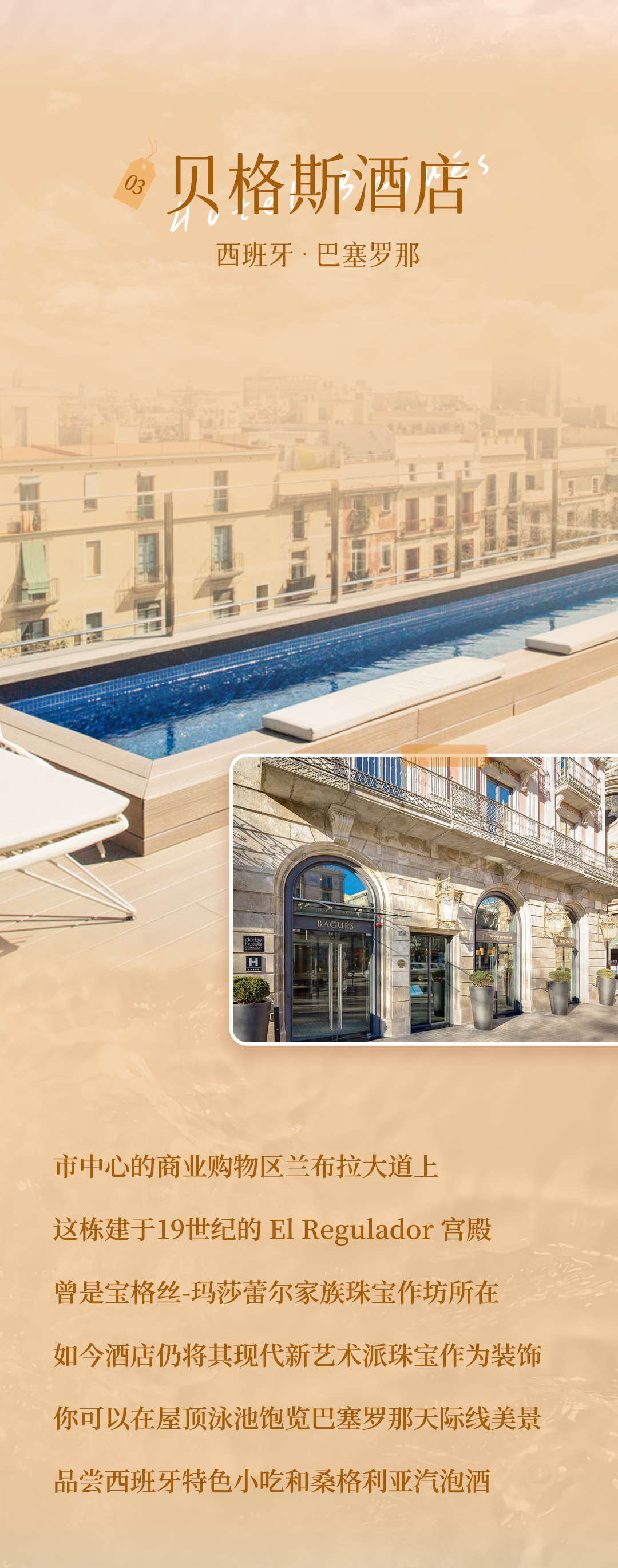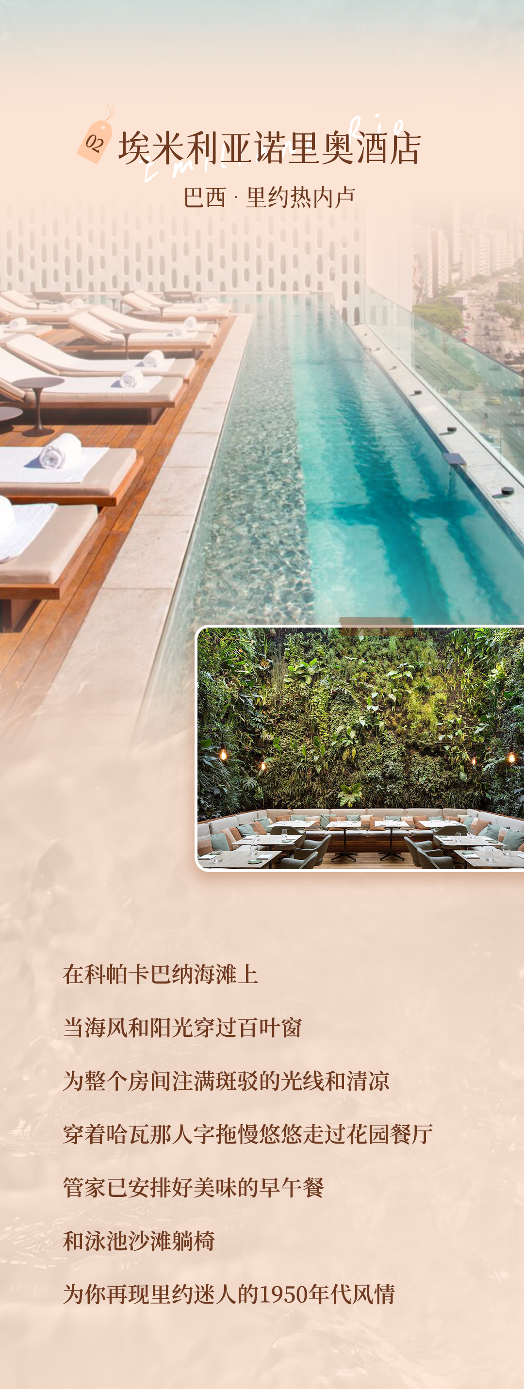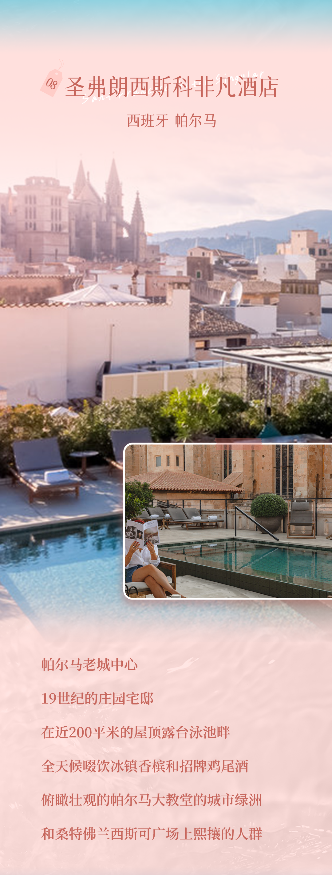 “突然羡慕一只鸟 除了去人间觅食 一辈子都在天空写诗” 摘录自 | 曹韵 《鸟之诗》 畅游屋顶泳池,有多酷?像是晕乎乎地漂浮在半空中, 在明媚晴空下与天际线相望, 都市街区、老城、海景无限延伸 …… 夜风轻拂,头顶繁星流动, 捧一杯池畔酒吧的香槟, 夜色愈深,氛围愈浓~ 本期SLH 特别推荐 9 家 极受欢迎的带屋顶泳池酒店 祝大家都有小得盈满的闲适生活~ 1尼布酒店 Nimb Hotel 丹麦·哥本哈根 哥本哈根著名的蒂沃丽花园内 镶嵌在摩尔宫殿的屋顶露台上的泳池 仿佛一颗闪闪发光的翡翠色马赛克宝石 俯瞰葱郁秀丽的花园和市中心美景 夜幕后还会亮起数以千计的小灯泡 让整个庭院如童话般梦幻 2. 埃米利亚诺里奥酒店 Emiliano Rio 巴西·里约热内卢 在科帕卡巴纳海滩上 当海风和阳光穿过百叶窗 为整个房间注满斑驳的光线和清凉 穿着哈瓦那人字拖慢悠悠走过花园餐厅 管家已安排好美味的早午餐和泳池沙滩躺椅 为你再现里约迷人的1950年代风情 3贝格斯酒店 Hotel Bagués 西班牙·巴塞罗那 市中心的商业购物区兰布拉大道上 这栋建于19世纪的 El Regulador 宫殿 曾是宝格丝-玛莎蕾尔家族珠宝作坊所在 如今酒店仍将其现代新艺术派珠宝作为装饰 你可以在屋顶泳池饱览巴塞罗那天际线美景 品尝西班牙特色小吃和桑格利亚汽泡酒 4弗兰卡别墅酒店 Villa Franca 意大利·波西塔诺 在山顶池畔的日光躺椅上欣赏 阿马尔菲海岸如明信片般的壮丽景色 在露台品尝鸡尾、新鲜海鲜和户外烧烤 或是漫步美丽的崖边小镇和热闹的海滩 沉醉于悠扬的钢琴乐声、电影和老式游戏 或是租一艘船和船长探秘迷人的那不勒斯湾 5卡塔赫纳印度莫维齐酒店 Movich Hotel Cartagena de Indias 哥伦比亚·卡塔赫纳 在历史名城卡塔赫纳 感受《霍乱时期的爱情》 眺望着加勒比海海岸风情 在空中酒吧、露台和屋顶泳池 微风中扑鼻而来的茉莉花香气里 尽情感悟自己对生活的热爱 6伊维萨阿加斯豪华大酒店 Aguas de Ibiza Grand Luxe Hotel 西班牙·伊比萨岛 伊比萨岛东海岸的圣埃乌拉利亚 迷失在各种风格的“白色梦境”中 日光下的泳池,俱乐部和花园露台 以自然风水为灵感的现代化陈设 营造了浓郁的夏日海边度假氛围 7卡萨殖民海岸温泉酒店 Casa Colonial Beach & Spa 多米尼加共和国·普拉塔港 琥珀海岸的金色沙滩和葱翠山脉 聆听着不远处静谧柔和的的海浪声 在这座殖民风建筑的屋顶无边泳池畔 享受水疗或跳水按摩浴缸,放松身心 眺望波光粼粼的加勒比海岸风光 8圣弗朗西斯科非凡酒店 Sant Francesc Hotel Singular 西班牙 帕尔马 帕尔马老城中心 19世纪的庄园宅邸 在近200平米的屋顶露台泳池畔 全天候啜饮冰镇香槟和招牌鸡尾酒 俯瞰壮观的帕尔马大教堂的城市绿洲 和桑特佛兰西斯可广场上熙攘的人群 9 特拉维夫诺曼酒店 The Norman Tel Aviv 以色列 特拉维夫 市中心这栋有着上百年历史的联排别墅 置身顶层无边泳池,饱览迷人落日景致 在露台遮阳伞下享受日光浴和按摩水疗 俯瞰令人耳目一新的包豪斯风格建筑群
