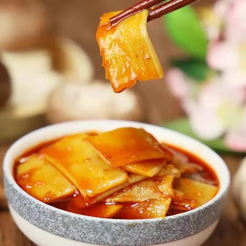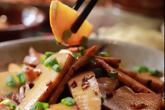 热锅烧油,放入少许花椒爆香后,倒入经清水漂洗处理后的春笋,爆炒几分钟直至煸炒出春笋清香,随后加入一勺正宗郫县豆瓣酱,调色增味的同时加添点辣味,最后根据个人口味加上食用盐、味精等调料,翻炒均匀后出锅装盘,再撒上些许葱花点缀。