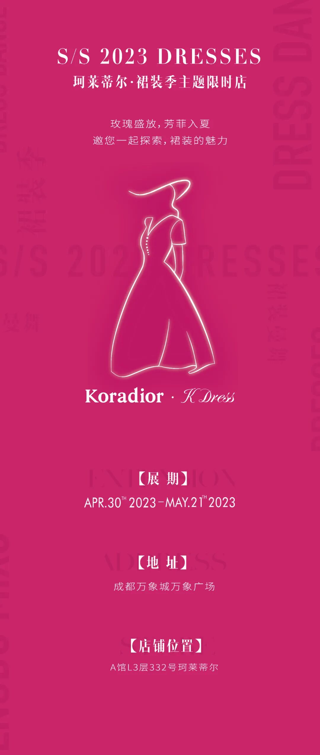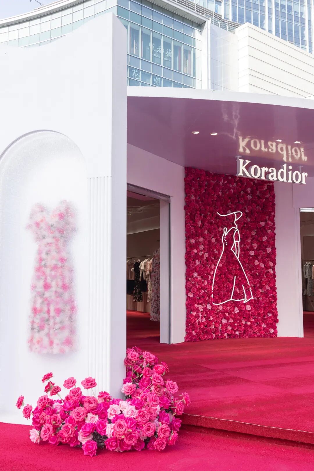 品牌经典连衣裙K dress,以艺术形态嵌入玫瑰花墙之中,以诠释女性如玫瑰独特的美与魅力,对玫瑰元素的艺术创作与设计突破,成就了其经典之作,打造属于Koradior式的时装态度,隽永优雅之姿。