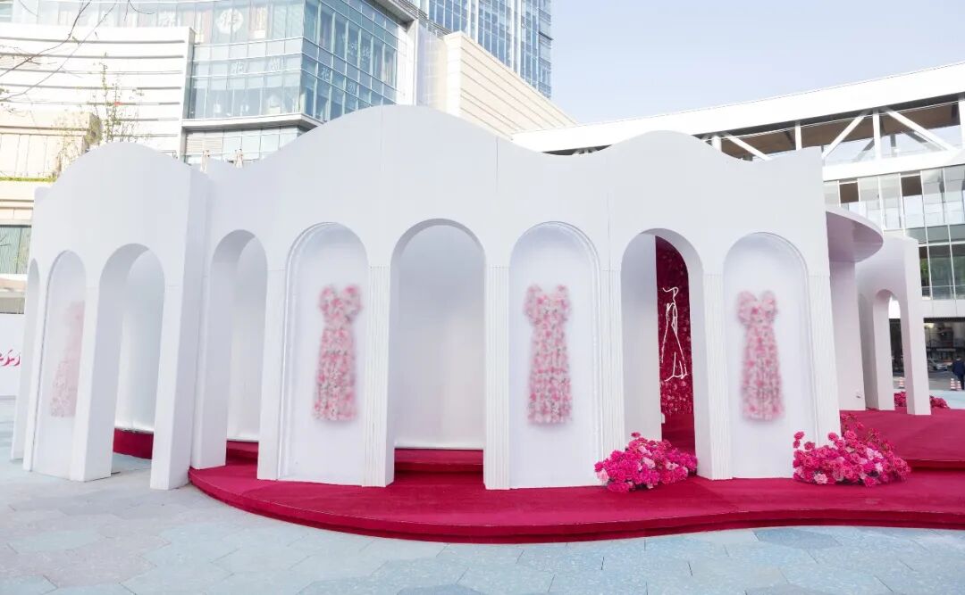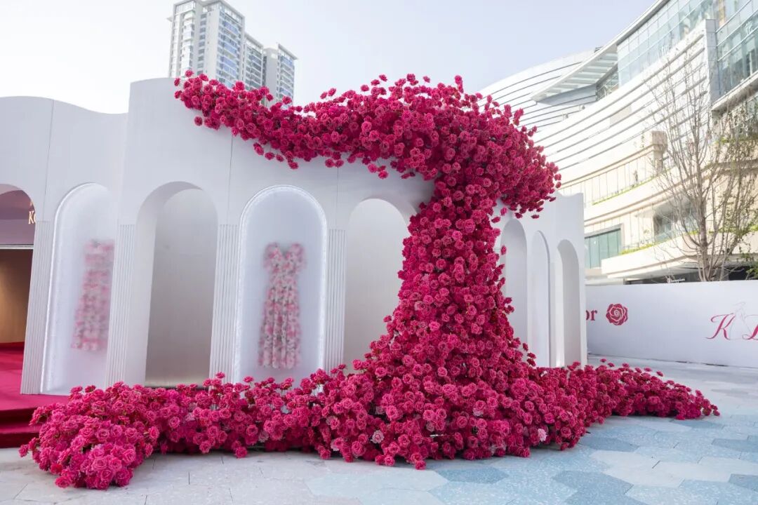倾泄而下的玫瑰瀑布,突破常规的艺术形态,空气中都弥漫着玫瑰香气,远远观望,如同一条巨型的玫瑰花连衣裙,使得视觉画面更具空间感与艺术气息。