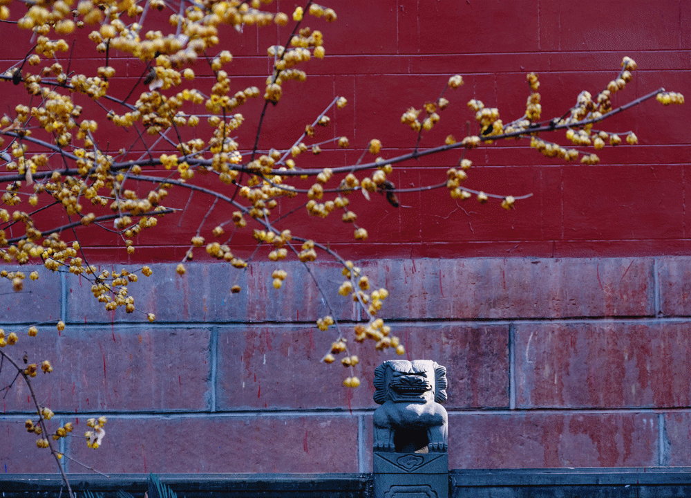 阳光下的黄花与红墙相映