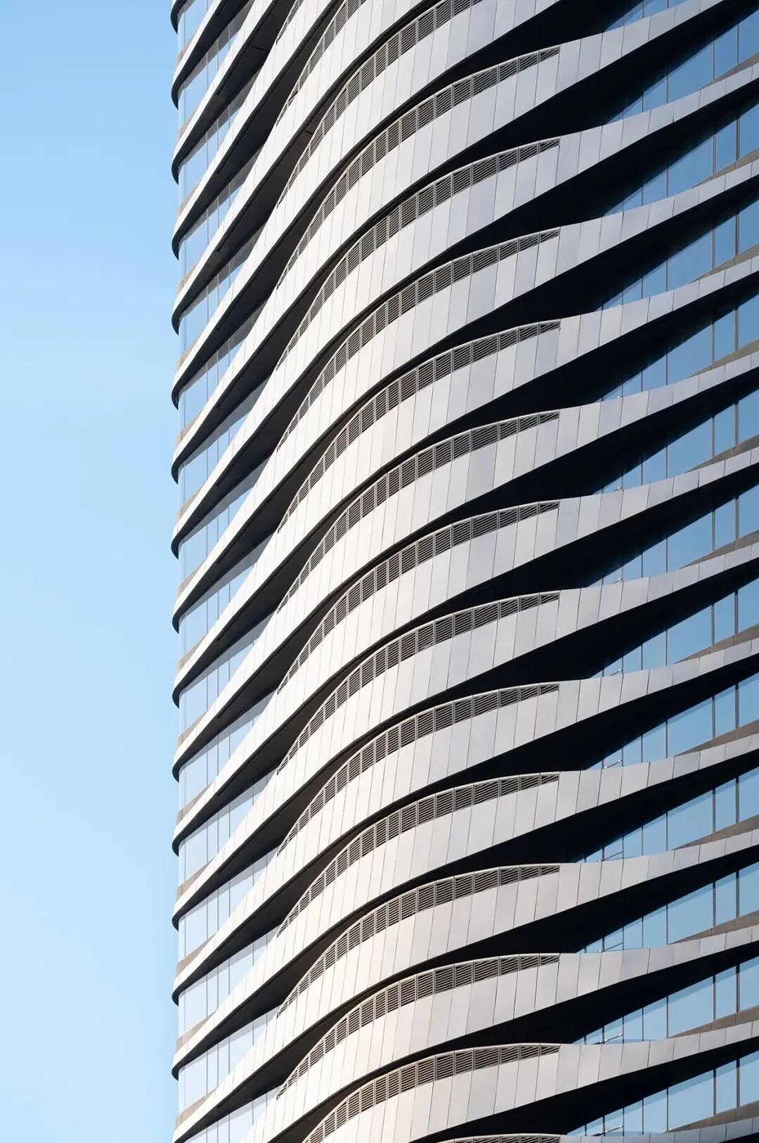 流畅的轮廓、波状起伏的曲线线条和丰富的材料特征,创造了独特的建筑外立面。塔楼修长的纺锤形态构成优雅的外形,同时,建筑内部涵盖11万㎡的办公空间、2万㎡的俱乐部会所设施和高端公寓。