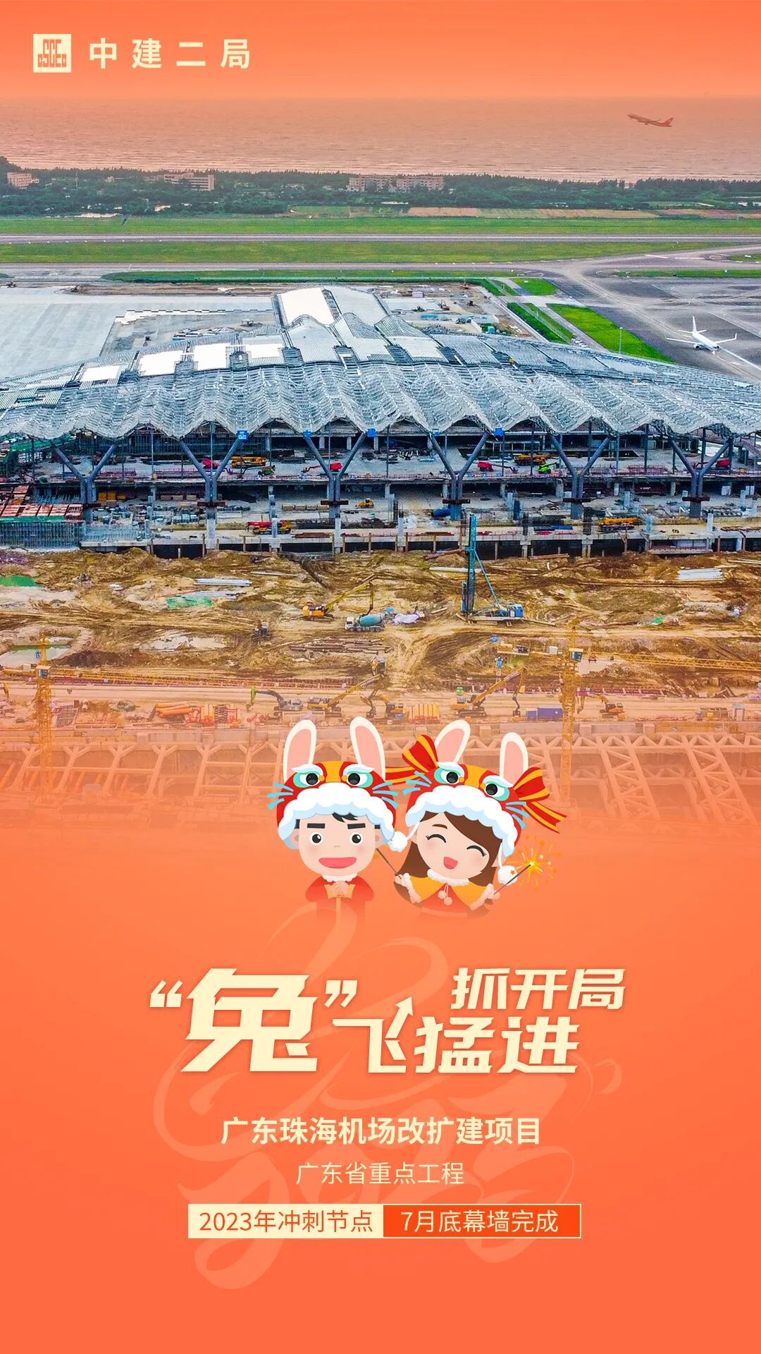 中建二局华南公司承建广东珠海机场改扩建项目位于珠海市金湾区,总建筑面积19.1万平方米,建筑高度最高40.25米,主要涵盖T2航站楼、装修装饰及机电工程等。项目预计将于2023年7月底完成幕墙部分建设任务,项目全部建成后将新增24个机位,可满足年旅客吞吐量2750万人次、年货邮吞吐量10.4万吨、年客机起降19.8万架次的运营需求。