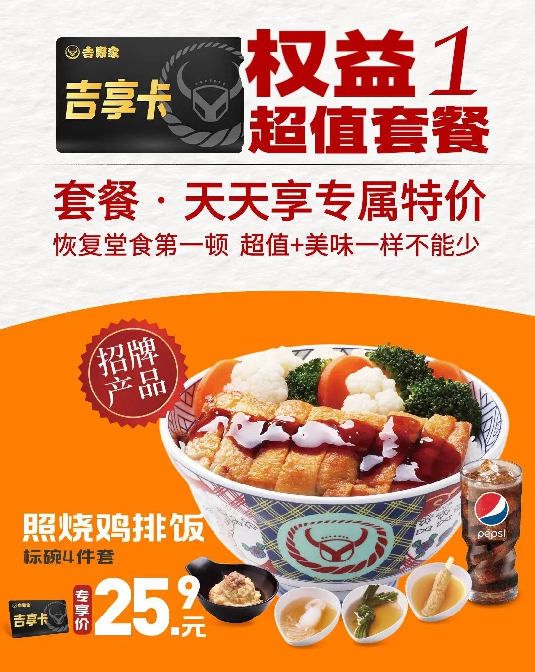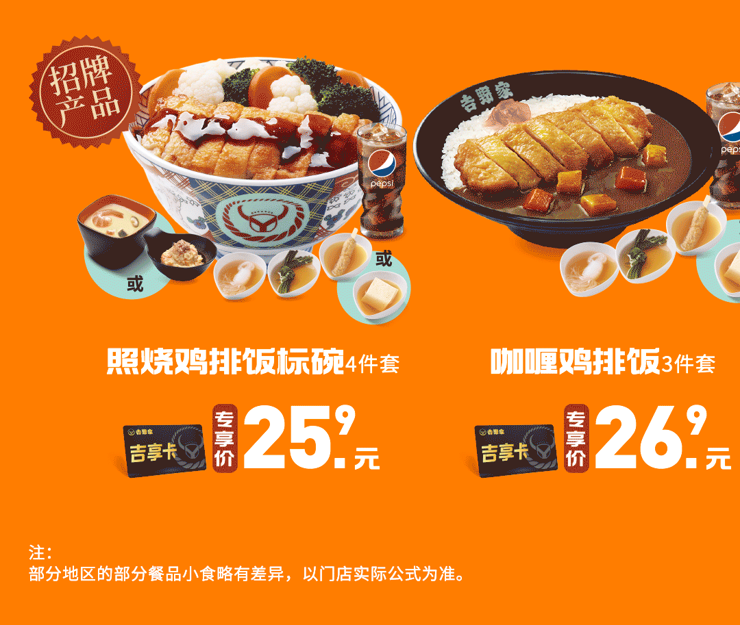 (1)吉野家吉享卡(会员权益卡)有效期内,可享受以最低25.9元购买一份人气经典套餐的权益。超值4件套包含主餐+中杯可乐+金枪鱼土豆泥+串点组合(魔芋丝+海带结+什锦鸡肉串),超值3件套包含主餐+中杯可乐+串点组合(魔芋丝+海带结+什锦鸡肉串)。其中餐品地区差异,黑吉辽、赤峰、通辽地区用合茶碗蒸代替金枪鱼土豆泥、用千页豆腐代替什锦鸡肉串;呼和、包头地区用合茶碗蒸代替金枪鱼土豆泥;河南地区用三色时蔬代替金枪鱼土豆泥。